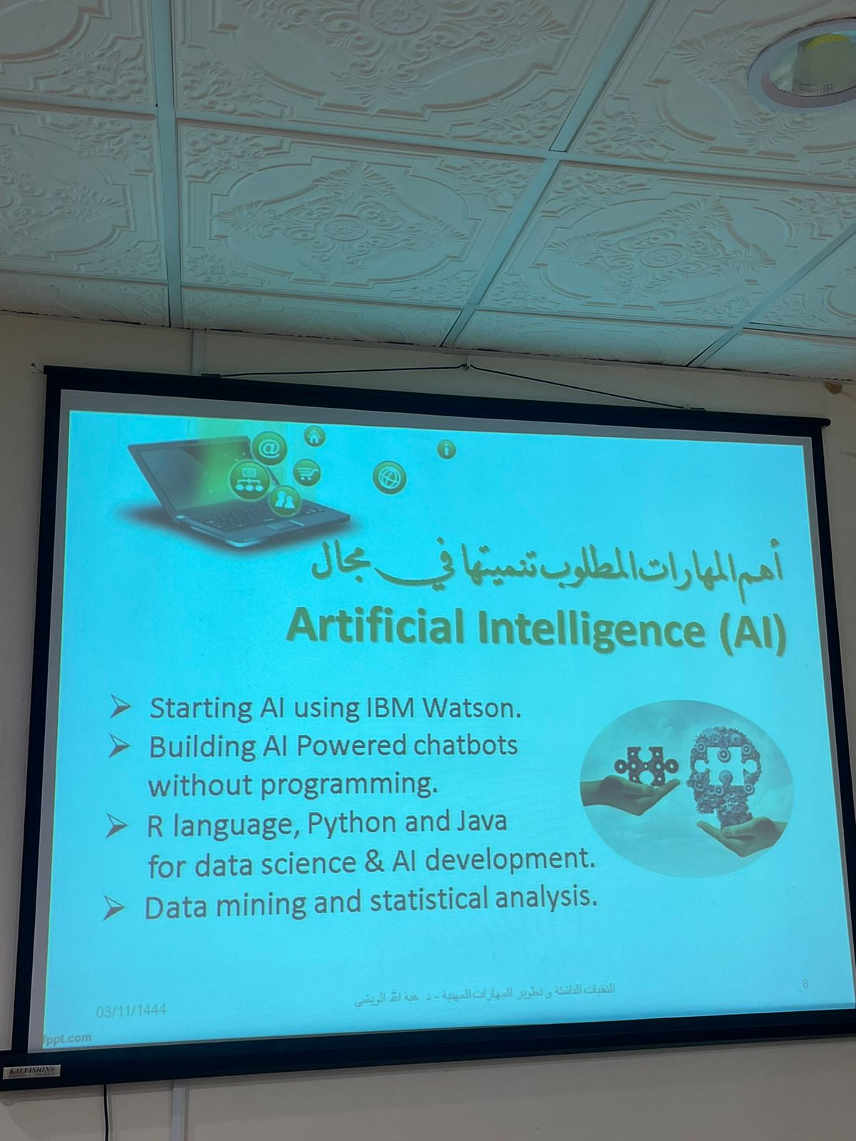 وبدأت باستعراض فيديو توعوي يتضمن أحدث اتجاهات تكنولوجيا المعلومات للعام 2023 ممثلة في Artificial Intelligence , Robotics and Process Automation, Blockchain Technology, Quantum Computing, Internet Of Things, Extended Reality, Supper apps, 5G and Wi-Fi 6 Technology.