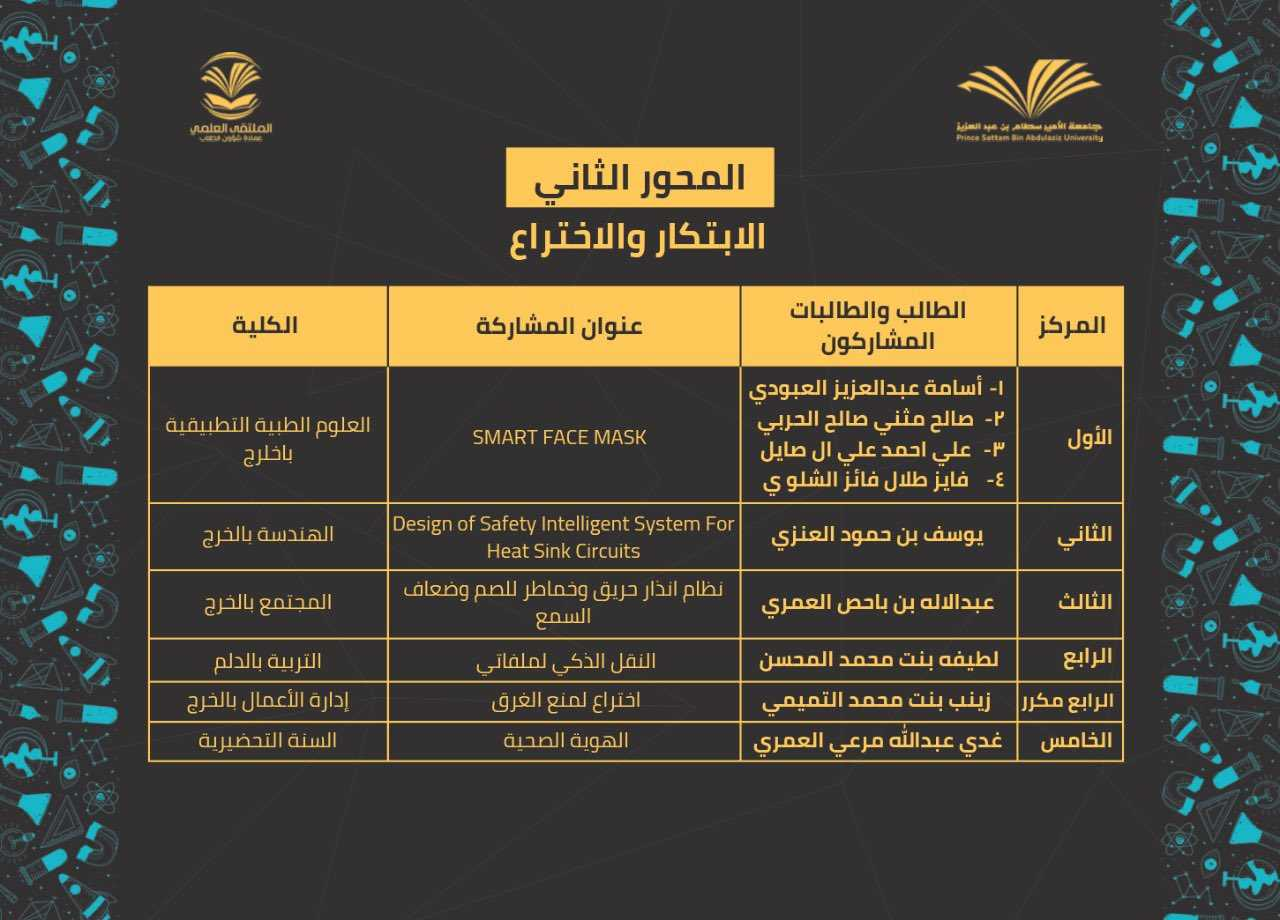 In its participation in the student scientific symposium organized by the deanship of student affairs on Sauday and Monday, 9-8/8/1442 AH, Al-Kharj Community College hits the third rank in the axis of innovation and inventions at the University level via a participation entitled “ Fire Alarm System Designed to the Deaf, “ which is prepared by Abdullah bin Bahis Al-Omari, and supervised by Mr. Radi Al-khatib.