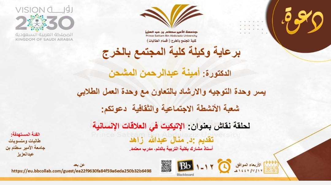 Under the patronage of Her Excellency the Vice Dean of the Community College in Al-Kharj, Dr. / Amina bint Abdulrahman Al-Mashhan; The Guidance and Counseling Unit, in cooperation with the Student Work Unit, established the Social and Cultural Activities Division in the college. A panel discussion entitled: “Etiquette in Human Relations”, on Wednesday 12-7-1442 AH - via the Zoom program - presented by Dr. Manal Zahid. Associate Professor at the College of Education in Dalam and a certified trainer at Prince Sattam bin Abdulaziz University.