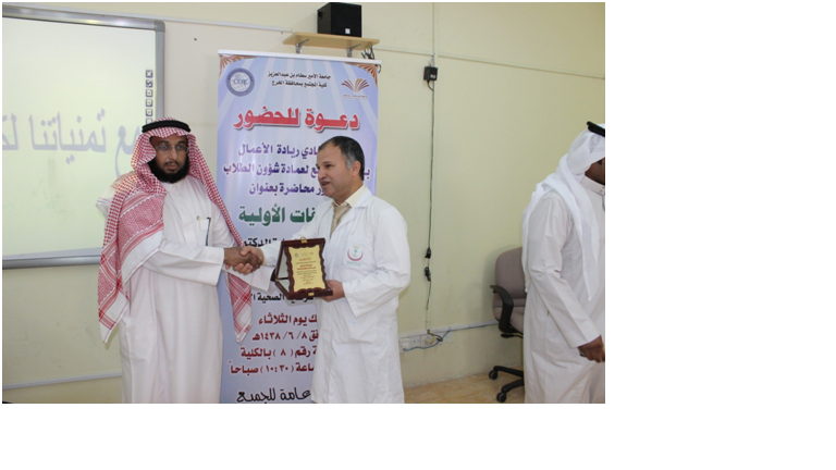 نظم نادي ريادة الأعمال بكلية المجتمع بالخرج التابع لعمادة شؤون الطلاب ورشة عمل بعنوان "الإسعافات الأولية" لسعادة الدكتور/ على سالم عايش أخصائي طب الأسرة وصحة المجتمع بمركز صحي السيح وذلك يوم الثلاثاء الموافق 8/6/1438هـ في تمام الساعة العاشرة صباحًا. وقد أشار سعادته إلى أن الإسعافات الأولية هي مجرد تقديم عناية طبية فورية ومؤقتة إلى إنسان مصاب أو مريض بغرض الوصل به إلى وضع صحي بأدوات أو مهارات علاجية بسيطة.