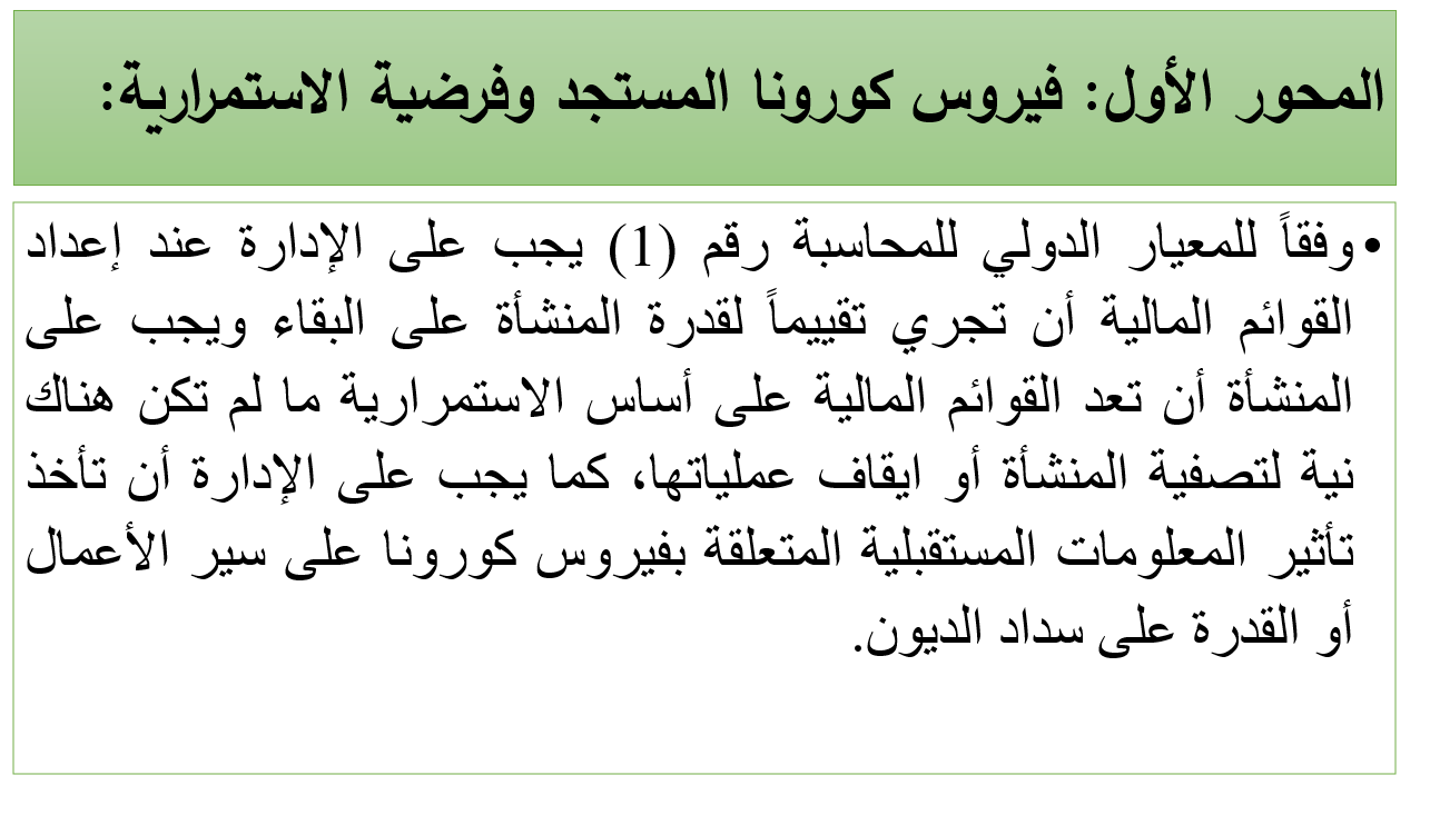 المحور الأول: فيروس كورونا المستجد وفرضية الاستمرارية: أثرت الإجراءات الاحترازية للحد من انتشار فيروس كوفيد-19 على الأعمال التجارية سواء من حيث الحد من نطاقها أو تقليل الطلب على المنتجات مما قد يثير شكاً حول قدرة المنشأة على البقاء كمنشأة مستمرة. ووفقا للمعيار الدولي للمحاسبة رقم (1) يجب على الإدارة عند إعداد القوائم المالية أن تجري تقييماً لقدرة المنشأة على البقاء ويجب على المنشأة أن تعد القوائم المالية على أساس الاستمرارية ما لم تكن هناك نية لتصفية المنشأة أو ايقاف عملياتها، كما يجب على الإدارة أن تأخذ تأثير المعلومات المستقبلية المتعلقة بفيروس كورونا على سير الأعمال أو القدرة على سداد الديون.