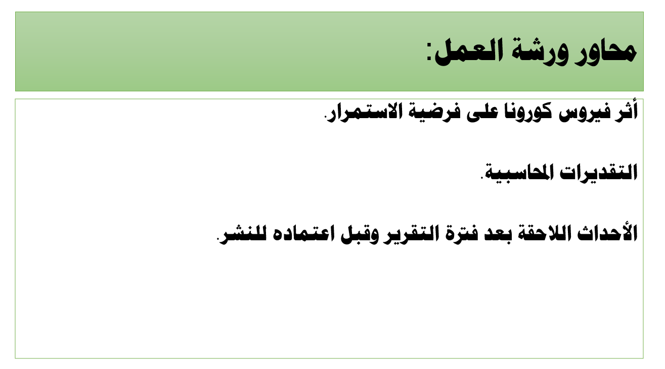 تناولت الورشة الآثار المحتملة لفيروس كورونا المستجد على التقارير المالية من خلال عدة محاور من أهمها ما يلي: