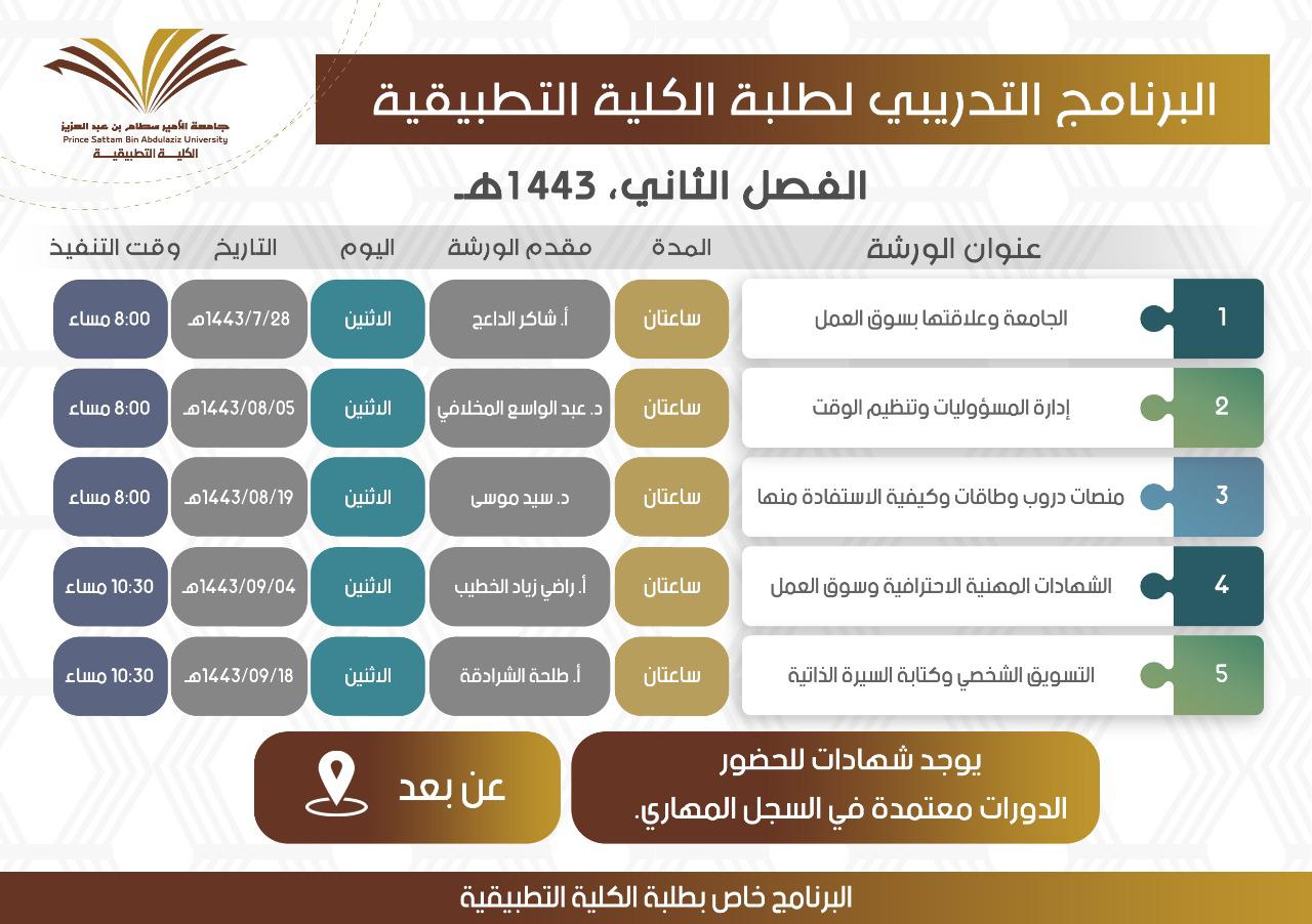 أطلقت الكلية التطبيقية برنامجها التدريبي للطلبة ابتداءَ من يوم الاثنين الموافق 2022/3/27م، حيث يتضمن البرنامج عددا من الدورات التدريبية في مجالات مختلفة، إذ تناول البرنامج التدريبي الجامعة وعلاقتها بسوق العمل، وإدارة المسؤوليات وتنظيم الوقت، ومنصات دروب وهدف وكيفية الاستفادة منها، والشهادات المهنية الاحترافية، والتسويق الشخصي وكتابة السيرة الذاتية، ويقدم الدورات أعضاء هيئة التدريس بالكلية.