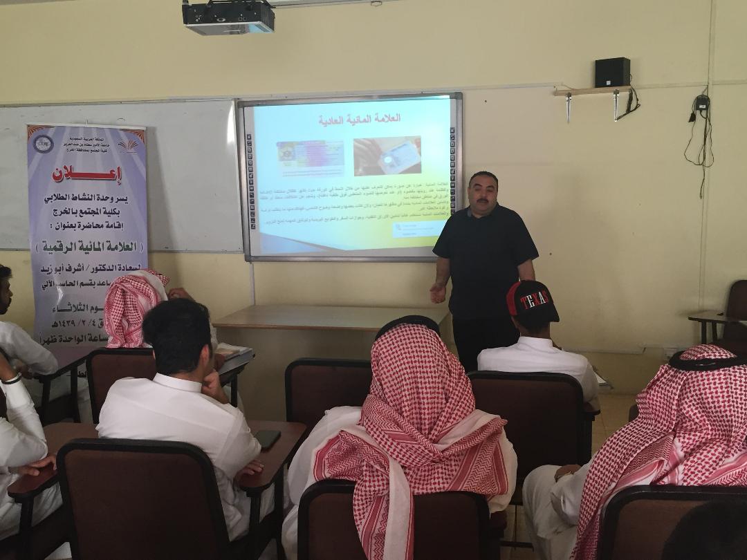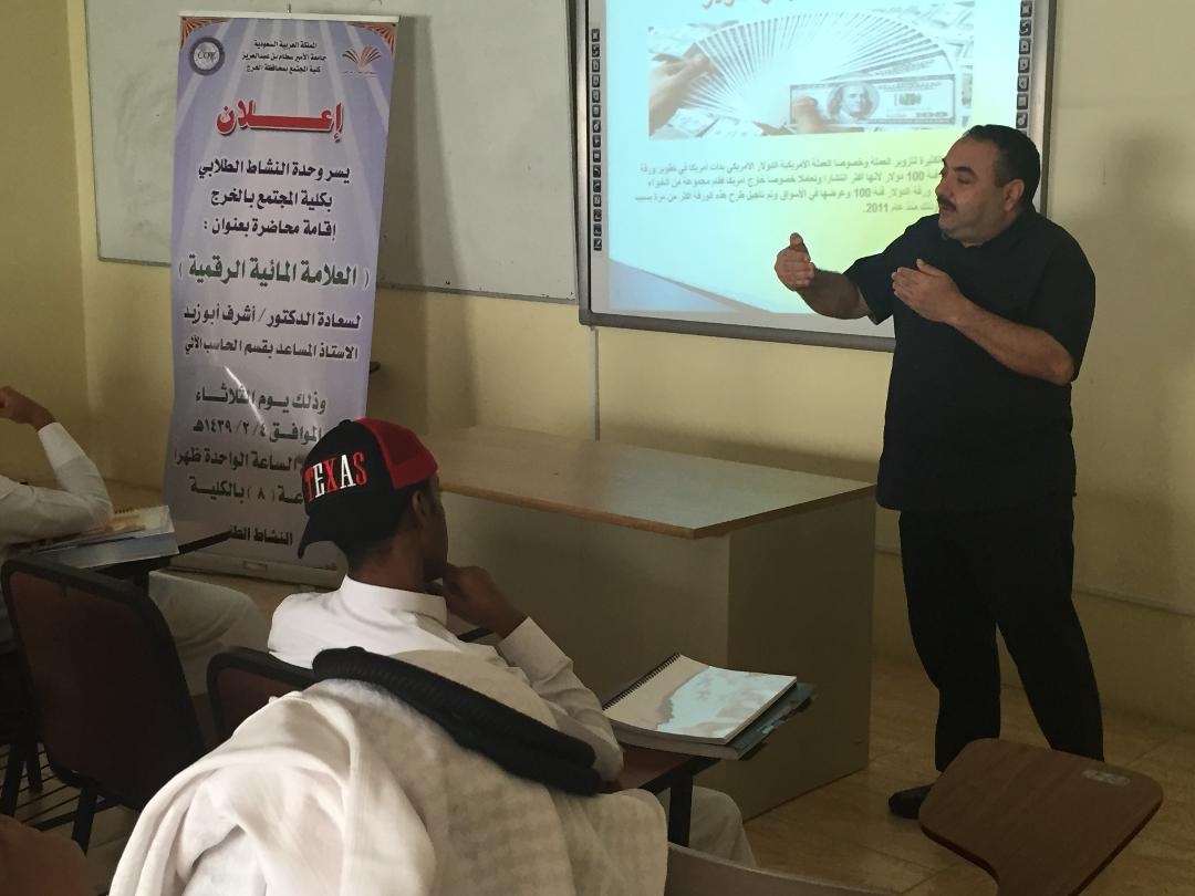 نظمت وحدة النشاط الطلابي بالكلية محاضرة بعنوان" العلامة المائية الرقمية" لسعادة الدكتور/ أشرف أبوزيد الاستاذ المساعد بقسم الحاسب الآلي بالكلية وذلك يوم الثلاثاء الموافق 4/2/1439هـ وقد تناولت المحاضرة تعريف العلامة المائية الرقمية، والشروط التى يجب أن تتوافر فيها ، ومراحل دورة حياة العلامة المائية الرقمية ، والمجالات التى تستخدم فيها هذه العلامة.