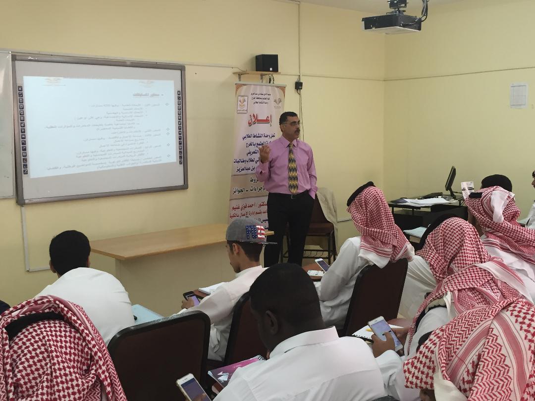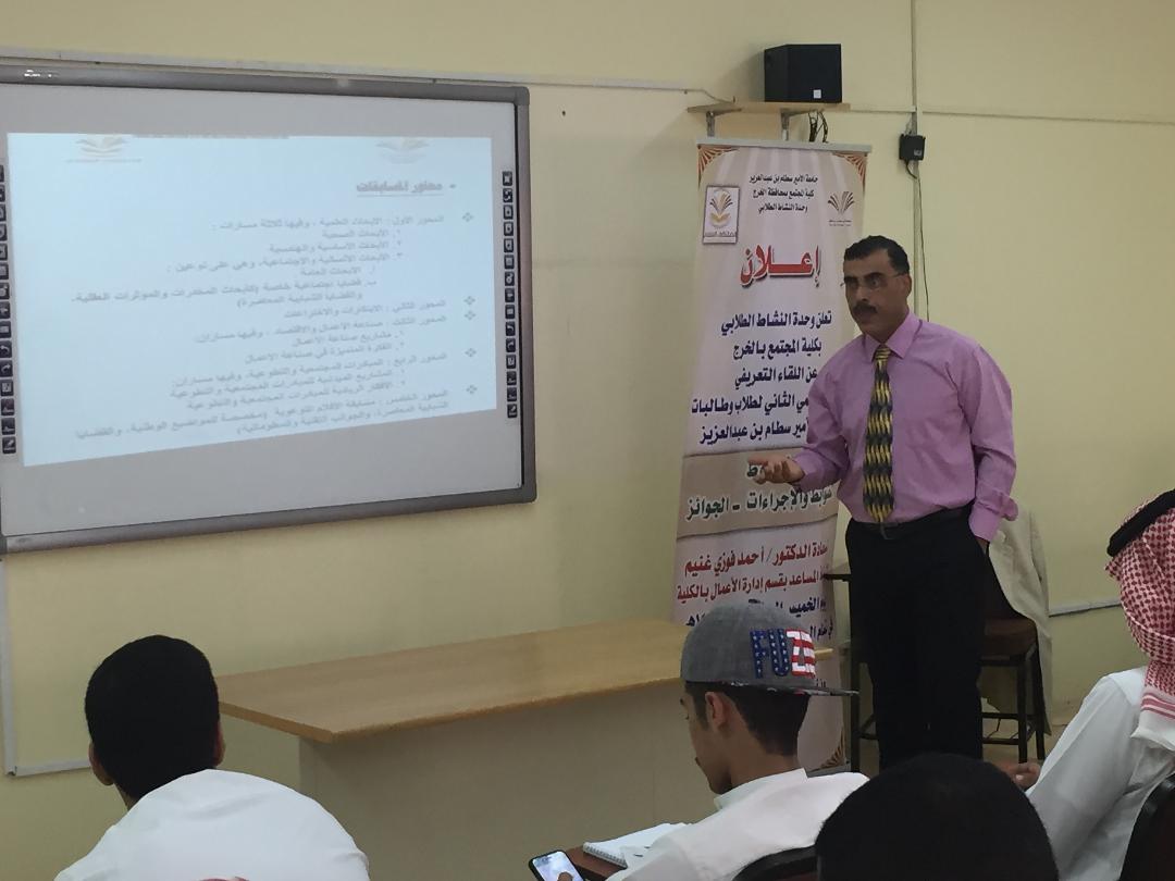 في إطار فعاليات الملتقي العلمي الثاني لطلاب وطالبات جامعة الأمير سطام بن عبد العزيز نظمت وحدة النشاط الطلابي بكلية المجتمع بالخرج لقاء تعريفي لطلاب ومنسوبي الكلية تقديم سعادة الدكتور/ أحمد فوزي غنيم الاستاذ المساعد بقسم إدارة الأعمال بالكلية وبحضور سعادة وكيل الكلية للشؤون التعليمية والأكاديمية الدكتور/ ناصر الشيحان وقد تناول اللقاء تعريف الطلاب بمحاور الملتقى، والضوابط والشروط، والجوائز التى تقدمها الجامعة للمشاركات الفائزة، كما تناول اللقاء عرض مرئي لأهم مشاركات الكلية في الملتقيات السابقة لتشجيع وتحفيز الطلاب على المشاركة.