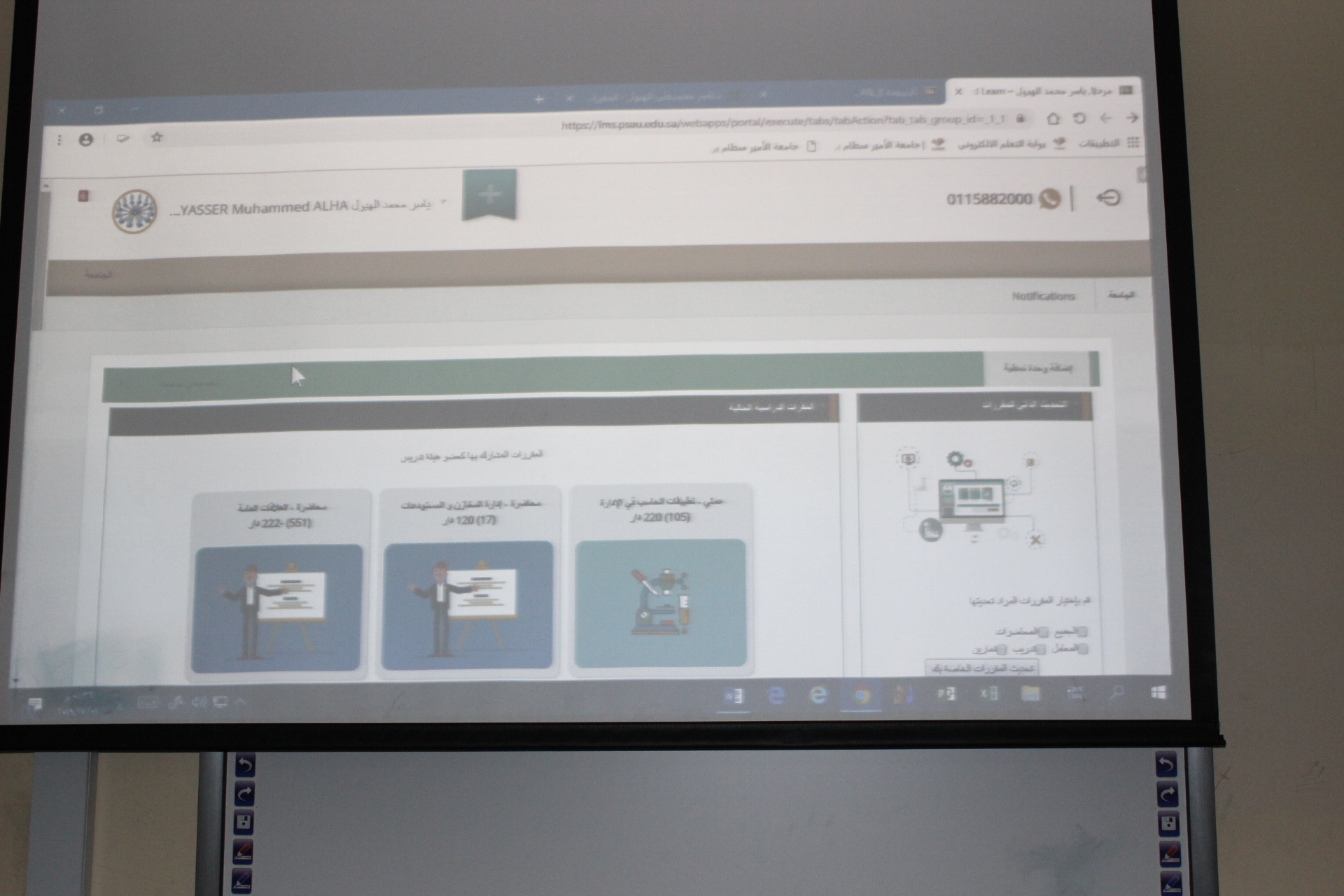 حرصًا من سعادة عميد كلية المجتمع بالخرج على أهمية تبني ممارسات التعلم الإلكتروني لتحسين جودة العملية التعليمية طالب بضرورة تنظيم عدة ورش لأعضاء هيئة التدريس والطلاب للتعريف بنظام البلاك بورد.    وانطلاقًامن ذلك نظمت وحدة التعلم الإلكتروني بالكلية ورشة عمل لأعضاء هيئة التدريس بعنوان" أساسيات التعامل مع نظام البلاك بورد"  استمرت لمدة أربعة أيام بدأت من يوم الأثنين الموافق 8/5/1440هـ حتى يوم الخميس الموافق 11/5/1440هـ  وقدم هذه الورشة الدكتور/ ياسر الهبول الأستاذ المساعد بقسم إدارة الأعمال بالكلية والمدرب المعتمد من الجامعة وقد تناولت الورشة عدة موضوعات من أهمها التعريف بصفحة المحتوى والتي تتضمن كيفية إنشاء عنصر أو ملف أو رفع صورة او فيديو تعليمي أو عمل ارتباط ويويب أو أخذ مقطع من You Tube. بالإضافة إلى كيفية إنشاء واجبات للطلاب والتعرف على طريقة تصحيحها. وكذلك تناولت الورشة التعرف على إعداد الاختبارات على نظام البلاك بورد وطريقة تصحيحها.كما تم التعرف أيضا على إنشاء منتدى تفاعلي بين أستاذ المقرر والطلاب بحيث يمكن للطلاب من خلاله الاستفسار عن كل ما يتعلق بالمقرر من خلال هذا المنتدى. كما تطرقت الورشة إلى كيفية استخدام الهواتف الذكية في التعلم الإلكتروني من خلال استخدام تطبيق البلاك بورد المتاح على هذه الهواتف لتشجيع أعضاء هيئة التدريس والطلاب على استخدام التعلم الإلكتروني. وبالإضافة إلى ذلك تناولت المحاضرة كيفية بناء الغرف الافتراضية وطريقة التواصل بين أستاذ المقرر والطلاب من خلال هذه الغرف.وأخيرًا توجه كافة أعضاء هيئة التدريس بالشكر والتقدير لسعادة عميد الكليةالدكتور/ حمد بن عبداللهالقميزي على إتاحة مثل الورش التعليمية التي تستهدف رفع كفاءة عضو هيئة التدريس والطلاب، وأيضا بخالص الشكر والتقدير إلى المدرب سعادة الدكتور ياسر الهبول على ما بذله من جهد وصبر لتوضيح الاستخدامات المختلفة لنظام البلاد بورد بشكل عملي.
