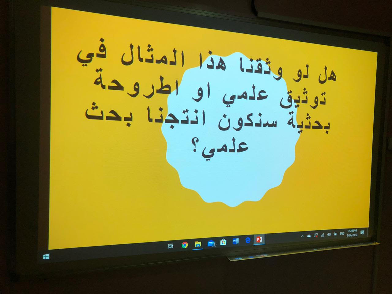 نوره دحيم شبيب الدوسرييعد البحث العلمي من أبرز أهداف رؤية المملكة 2030 الهادفة إلى الارتكاز على نقل الاقتصاد الوطني في مجالات مختلفة بدل الاعتماد على النفط.لذلك تطمح الجامعة وتهدف لجعل البحث العلمي هو الاستثمار طويل الأمد.وتزامناً مع انطلاق البرنامج التدريبي التأهيلي للملتقى العلمي الطلابي الرابع نظمت وحدة العمل الطلابي بكلية المجتمع ورشة عمل بعنوان "اساسيات البحث العلمي وكيفية كتابة ونشر الأوراق العلمية". من تقديم الدكتورة / خضرة حسن علي.وقد تناولت الدكتورة خضرة عدد من النقاط الهامة كان منها :كيفية الصياغة الدقيقة والسليمة لعنوان البحث.النقاط التي يجب الإشارة إليها وكتابتها في مقدمة البحث.كيفية اختيار وتحديد وصياغة مشكلة البحث.التفرقة بين هدف البحث وأهمية البحث.كيفية صياغة فروض البحث.كيفية اختيار عينة الدراسة.كما وضحت الدكتورة خضرة كيفية كتابة مراجع البحث؛ وكذلكخطوات كتابة الأوراق العلمية؛ وخطوات نشر الأوراق العلمية؛والجهات المعتمدة لنشر الأبحاث العلمية.وفي نهاية الدورة التدريبية تقدمت سعادة وكيلة الكلية الدكتورة أمينة المشحن بخالص شكرها للدكتورة خضره على تقديمها الدورة التدريبية ولطالبات الكلية على الحضور والتفاعل وحثت الطالبات على ضرورة المشاركة في محاور الملتقى العلمي لما لها من اثر في صقل شخصية الطالبة وتنمية مهاراتها.