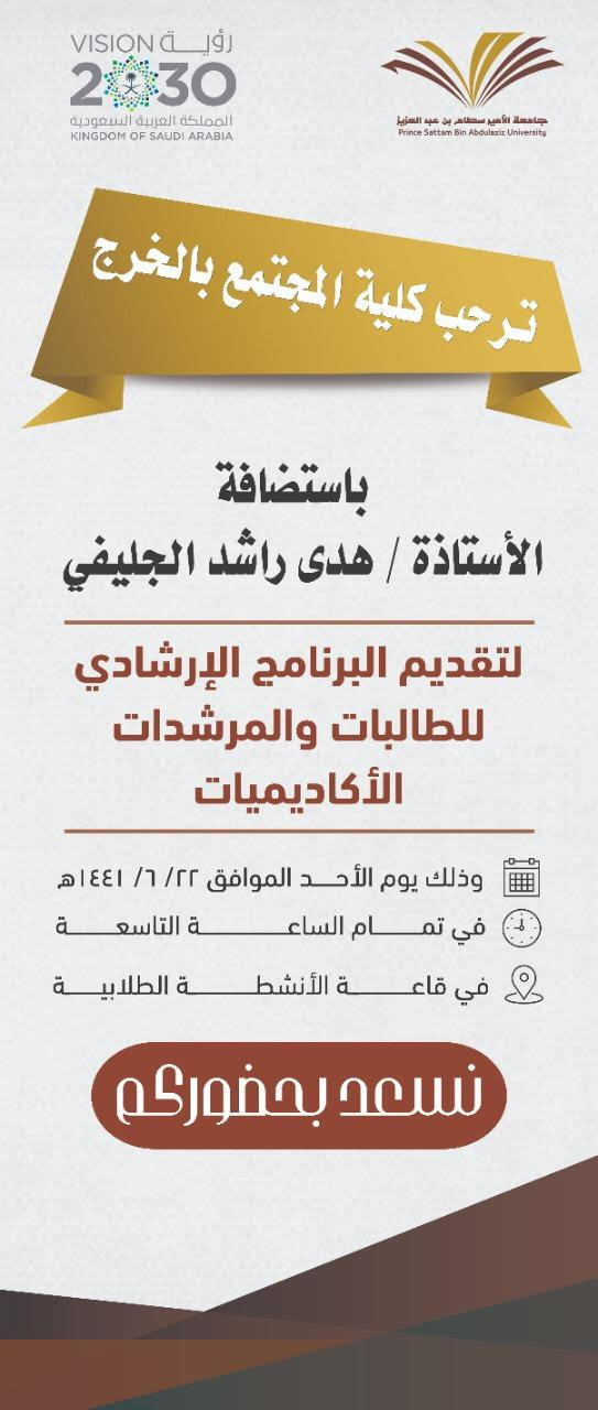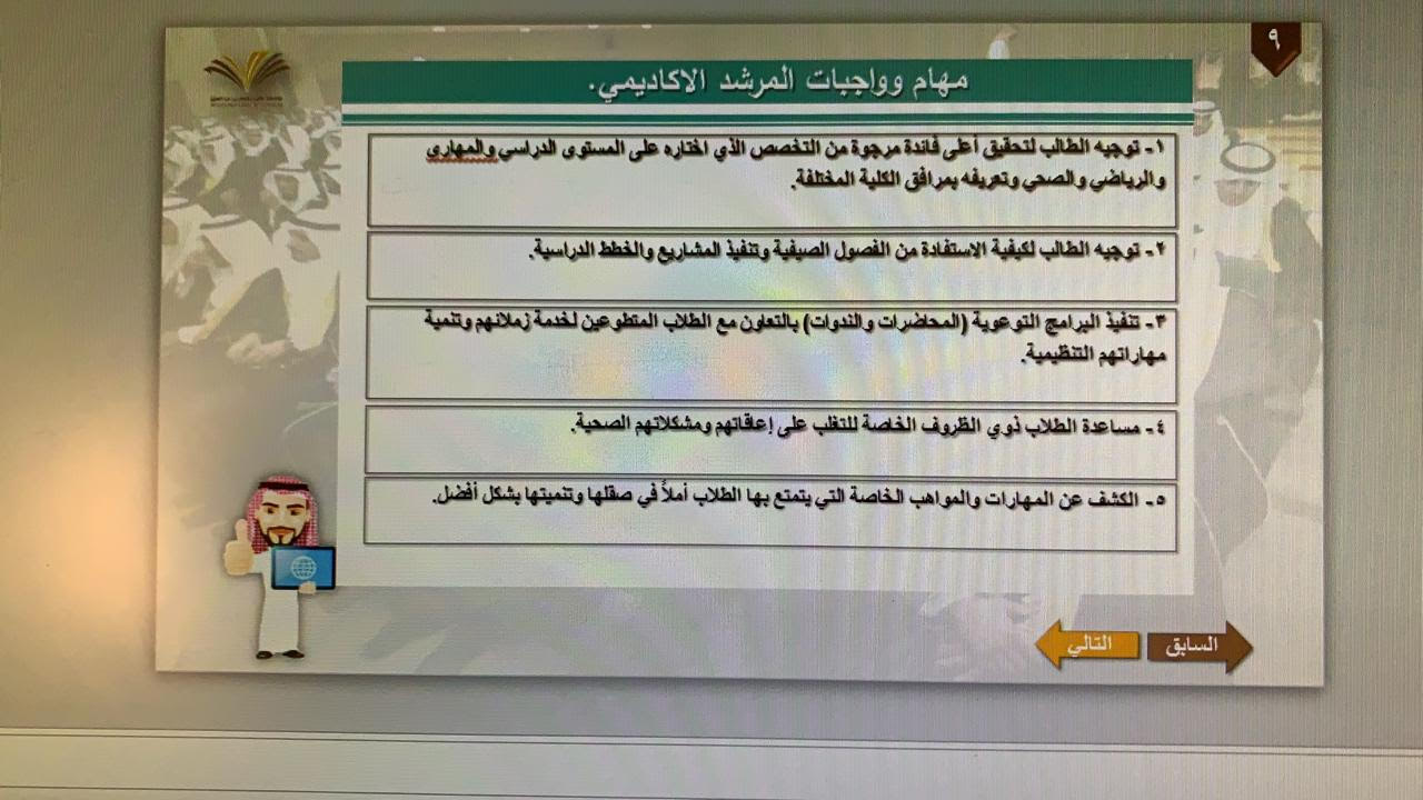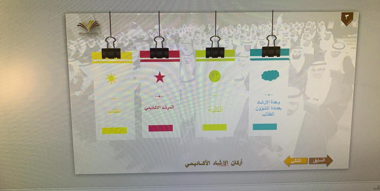 نوره دحيم شبيب الدوسريبرعاية سعادة وكيلة كلية المجتمع الدكتورة/ أمينة بنت عبد الرحمن المشحن؛ نظمت وحدة الإرشاد الأكاديمي بالتعاون مع وحدة العمل الطلابي بالكلية يوم الأحد الموافق ٢٢-٦-١٤٤١ هـ برنامجاً في الإرشاد الأكاديمي للطالبات والمرشدات الأكاديميات من إعداد وتقديم الأستاذة/ هدى راشد الجليفي؛ مشرفة وحدة الإرشاد الأكاديمي بوكالة الطالبات بعمادة شؤون الطلاب، واشتملت الورشة على عدة محاور كان من أهمها:١/ أركان الإرشاد الأكاديمي.٢/ مهام الإرشاد الأكاديمي.٣ /شرح تفصيلي لمهام الإرشاد الأكاديمي.٤/ مطبوعات هامة للطالبة والمرشدة الاكاديمية.٥/شرح تفصلي لدليل الإرشاد الأكاديمي.كما وضحت الأستاذة هدى بعض النقاط الهامة لعضوة هيئة التدريس والطالبة حول الإرشاد الأكاديمي وقد شهد اللقاء اقبال كبير من طالبات واعضاء هيئة التدريس بالكلية.وفي نهاية اللقاء تقدمت وكيلة الكلية بخالص الشكر للأستاذة هدى الجليفي على تقديمها اللقاء ولوحدة الإرشاد الأكاديمي على جهودهم المبذولة لتثقيف عضوات هيئة التدريس والطالبات بمهام وحدة الإرشاد الأكاديمي. وأوضحت وكيلة الكلية أن الإرشاد الأكاديمي يحظى باهتمام سعادة عميد الكلية الدكتور حمد بن عبدالله القميزي؛ حيث تم تشكيل لجان خاصة بالإرشاد الأكاديمي داخل الكلية؛ كما تم التأكيد على جميع أعضاء وعضوات هيئة التدريس بمتابعة الطلاب والطالبات إرشادياً؛ وقدمت الكليات عدداً من البرامج الإرشادية وذلك في سبيل تحقيق الطلاب والطالبات مستويات متميزة في التحصيل العلمي.
