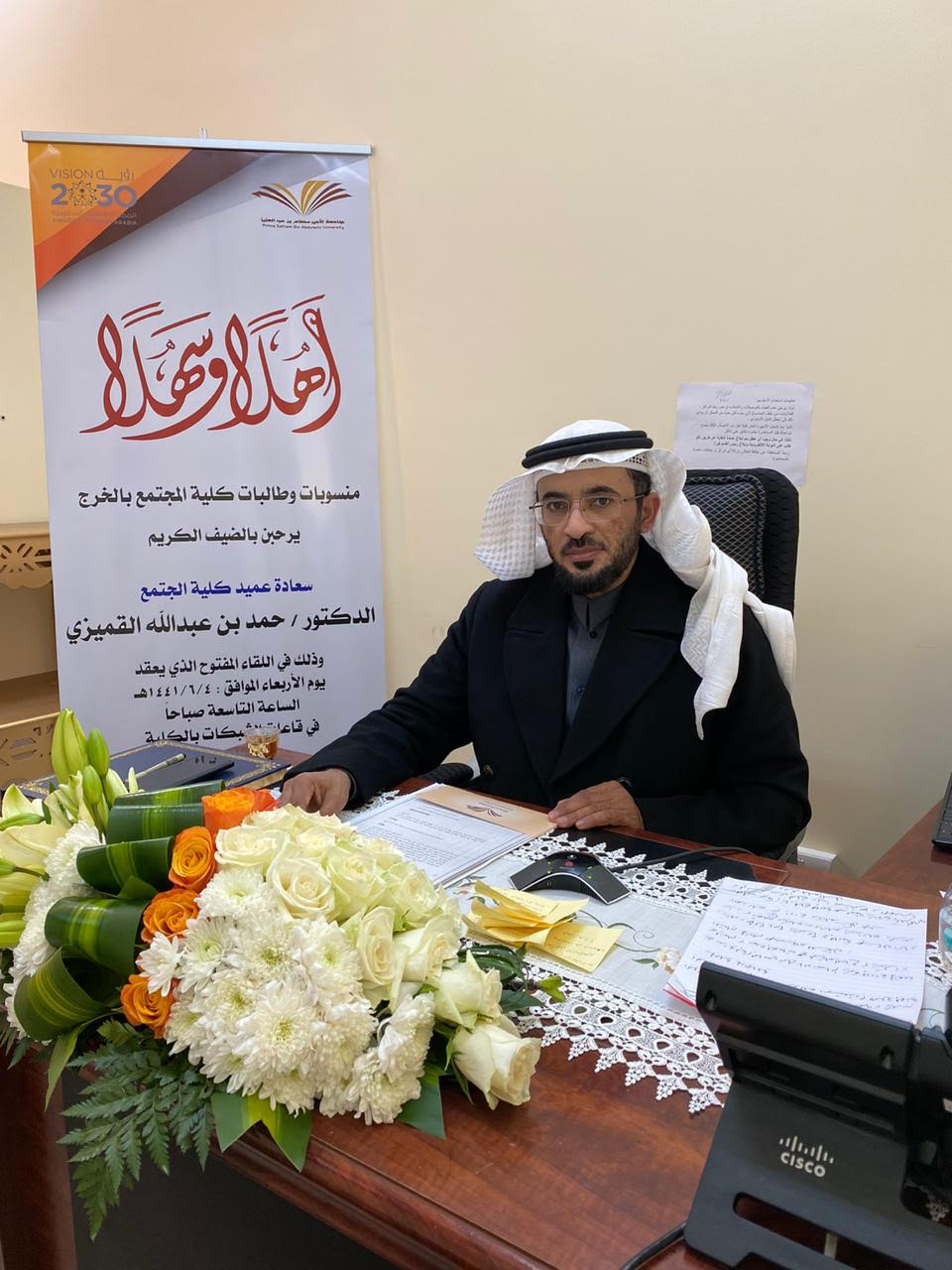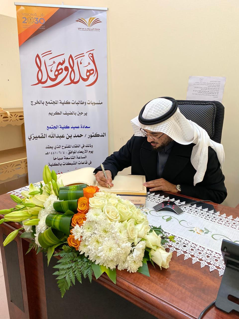نوره دحيم شبيب الدوسريمن منطلق الدور الذي تقوم به كلية المجتمع تجاه طالباتها وتوفير البيئة التعليمية المناسبة لهم وإيماناً منها بأهمية التواصل بين الطالبات وإدارة الكلية؛ نظمت وحدة العلاقات العامة والإعلام بكلية المجتمع بالخرج (قسم الطالبات) في صباح يوم الأربعاء الموافق 4/6/1441هـ لقاءً مفتوحاً مع سعادة عميد الكلية الدكتور/ حمد بن عبد الله القميزي. عبر الدائرة التلفزيونية بالكلية.وقد ابتدأ سعادة الدكتور اللقاء بحمد الله والثناء عليه وشكر الله تعالى على ما تنعم به بلادنا من الأمن والأمان والاستقرار في ظل ما تتعرض له العديد من دول العالم من اضطرابات ومخاطر. سائلاً الله ان يديم على هذه البلاد ما تنعم به في ظل حكومتنا الرشيدة؛ ثم توجه سعادته بالشكر لجميع القائمين على أقسام الطالبات في الكلية وعلى رأسهم سعادة وكيلة الكلية الدكتورة/ أمينة بنت عبد الرحمن المشحن، وأعضاء هيئة التدريس والهيئة الإدارية على جهودهم المميزة المبذولة لسير العملية التعليمية في الكلية. ثم ابتدأ سعادته حديثه للطالبات بتوضيح تاريخ نشأة الكلية وكيفية انضمامها لهذا الصرح الشامخ جامعة الأمير سطام بن عبد العزيز. ثم قدم سعادته عدداً من التوجيهات التي تساعد الطالبة على التفوق والنجاح في دراستها، وبين سعادته بعض الأمور التي تساعدهن على تحقيق وظائف مناسبة لهن في القطاعات الحكومية والخاصة.واستكمل سعادته حديثه بهمسات أبويه للطالبات موضحاً فيها أهمية المرحلة الجامعية للطالبة. وأهمية الانضباط فيها وكذلك أهمية إدارة الوقت للطالبة الجامعية وضرورة تحلي الطالبة بالأخلاق الحميدة.وفي نهاية حديث سعادته بين مجموعة من الخطوط الحمراء التي ينبغي على الطالبة الانتباه والحذر من تجاوزها كالدين والوالدان والوطن. ثم بعد ذلك أجاب سعادته على الأسئلة الموجهة له من قبل الطالبات ووقف على احتياجاتهن ووعدهن ببذل قصارى جهدة لتحقيق آمالهن وتطلعاتهن بما فيه مصلحتهن. وانتهى اللقاء بتقديم منسوبات كلية المجتمع شكرهن لسعادته على تشريفه الكلية واستجابته للدعوة.