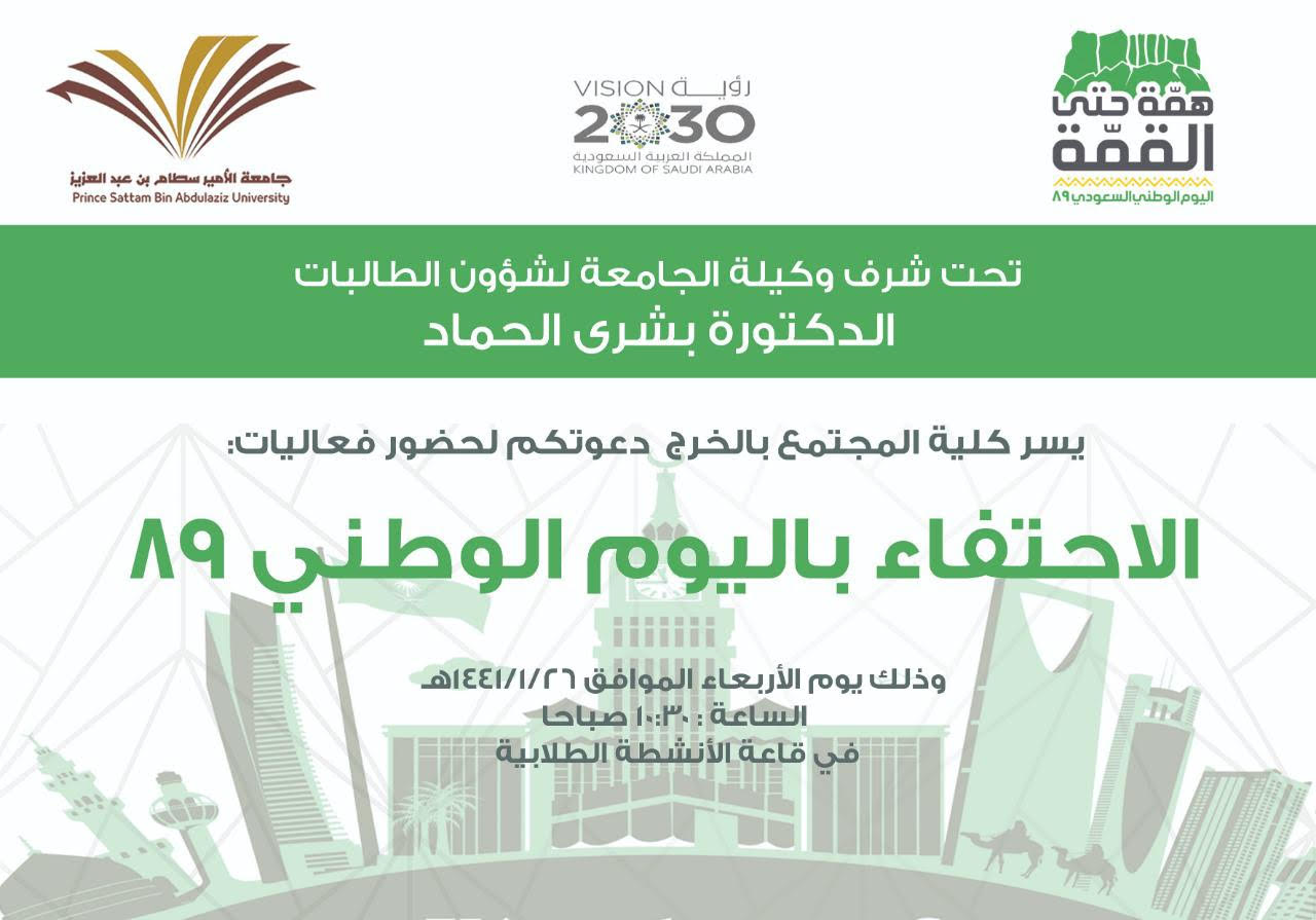 على شرف سعادة وكيلة الجامعة لشؤون الطالبات الدكتورة / بشرى بنت احمد الحماد .  يسر كلية المجتمع بالخرج أقسام الطالبات دعوتكم لحضور فعاليات الاحتفاء باليوم الوطني 89 وذلك يوم الأربعاء الموافق 26/1/1441هـ الساعة العاشرة والنصف صباحاً في مقر الكلية .                                                                        فحياكم الله .