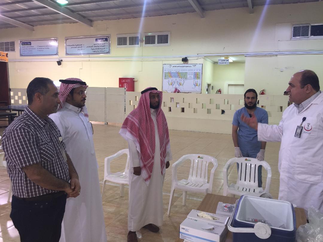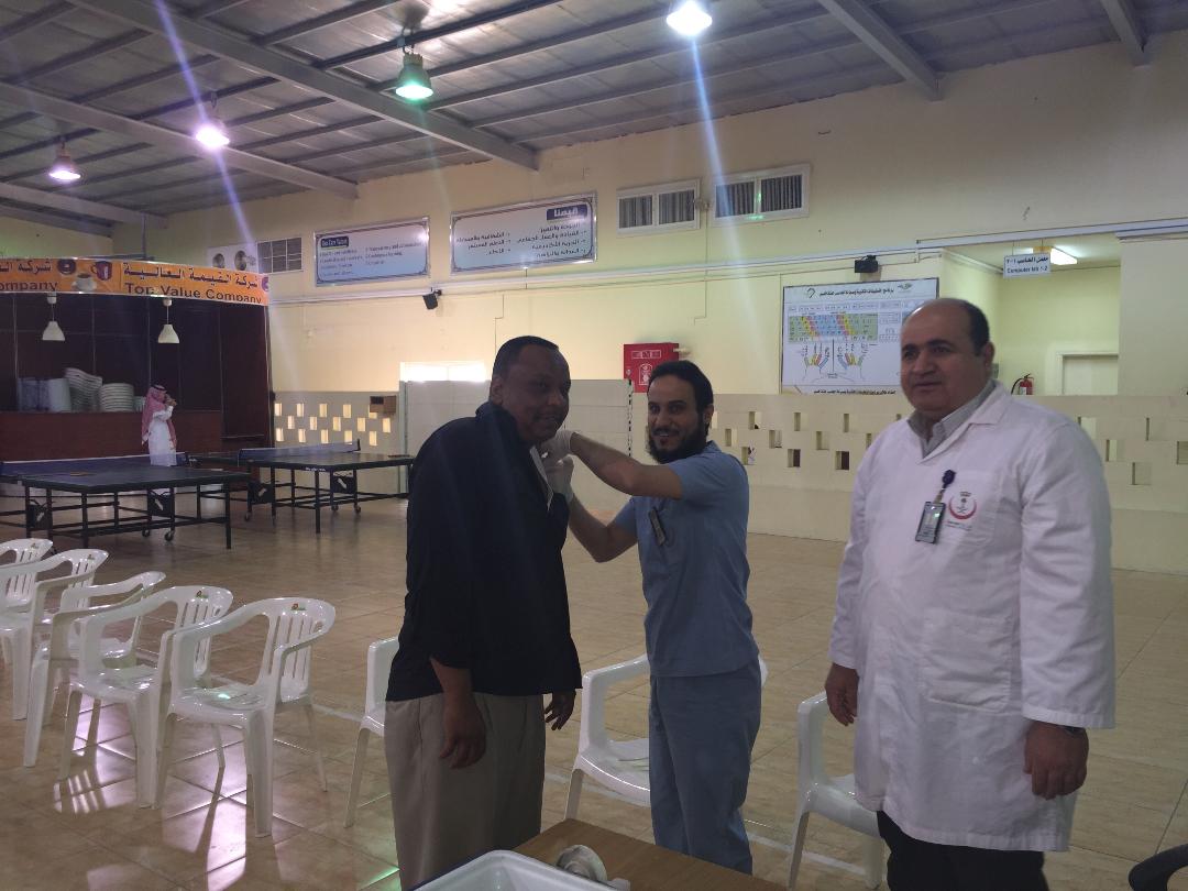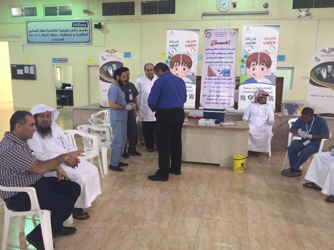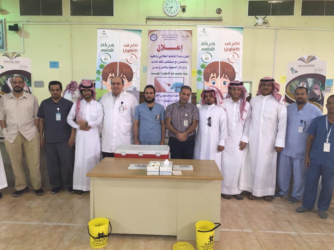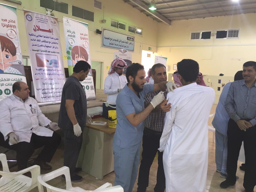 نظمت وحدة النشاط الطلابي بكلية المجتمع بالخرج حملة للتطعيم ضد الأنفلونزا الموسمية بالتعاون مع مستشف الملك خالد بالخرج وذلك يوم الثلاثاء الموافق 25/2/1439هـ وقد تم تطعيم أكثر من (300) طالب في المستويات المختلفة بالكلية، وكذلك تطعيم منسوبي الكلية من أعضاء هيئة التدريس والموظفين من الإداريين والعمال بالكلية، وقد أشاد سعادة الأستاذ الدكتور/ سعيد بن نزال العنزي عميد الكلية بجهود مستشفى الملك خالد بالخرج في نشر الوعي الصحى طوائف المجتمع المختلفة وأكد سعادته على أهمية التعاون مع المستشفى في تنظيم حملات توعوية مختلفة مكافحة التدخين، والمخدرات وغيرها من القضايا التى تهدد حياة الطلاب.
