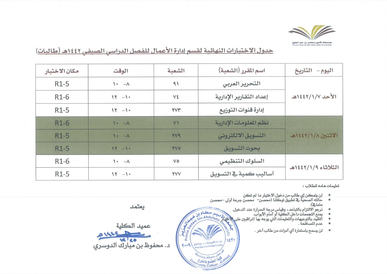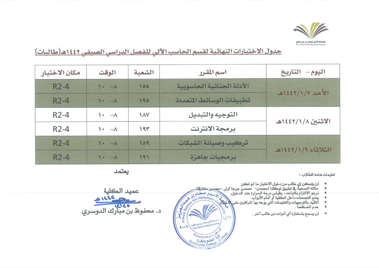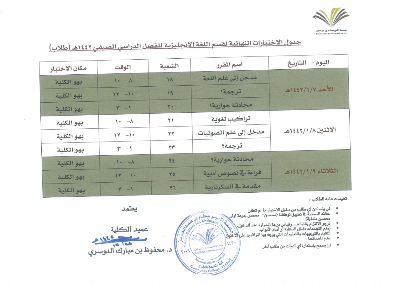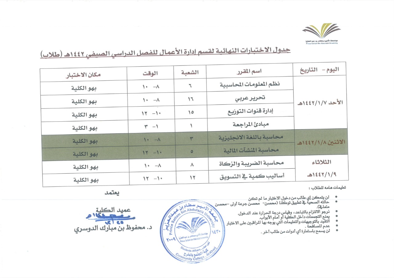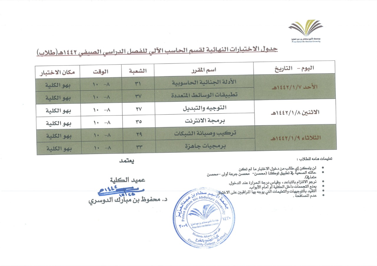 جدول الاختبارات النهائية للفصل الدراسي الصيفي 1442 هـ (طلاب وطالبات)