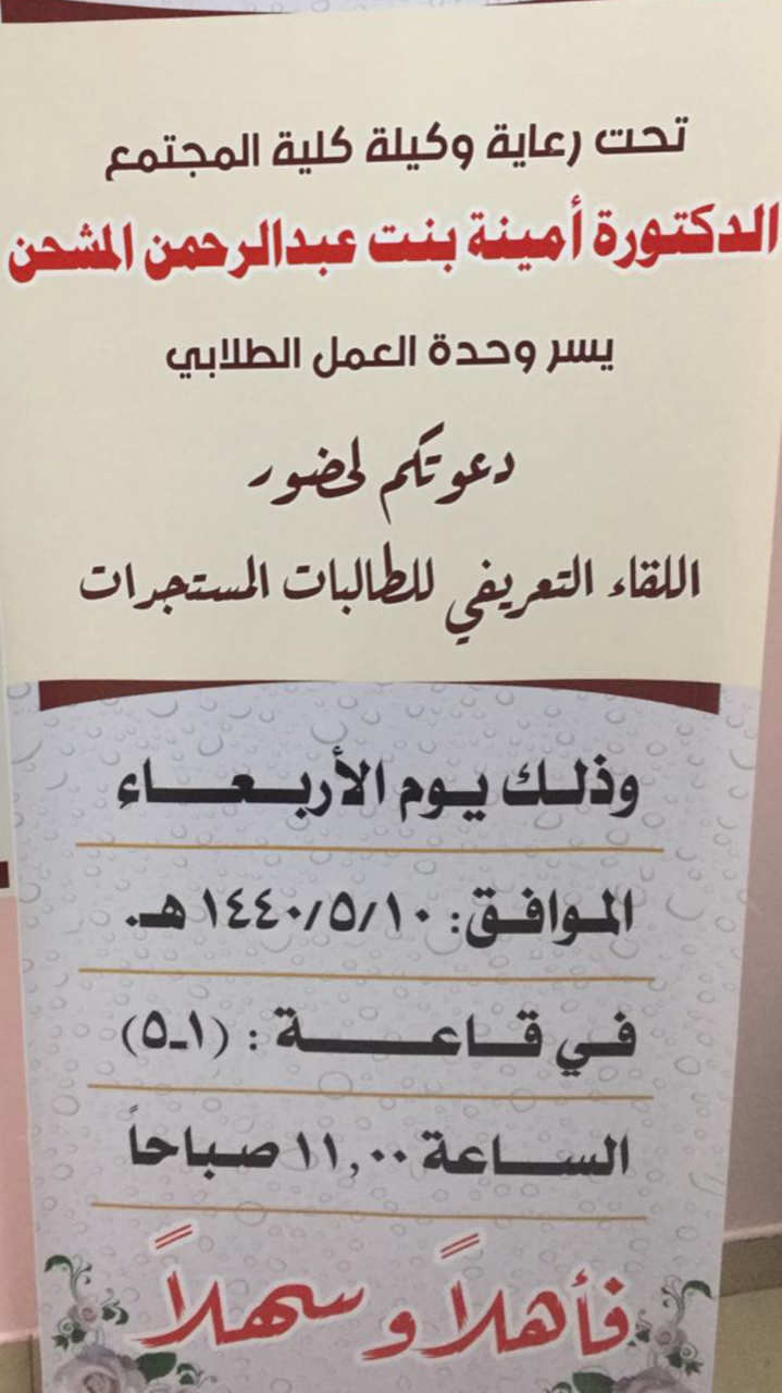 أقامت كلية المجتمع على شرف وكيلة الكلية الدكتورة/ أمينة بنت عبدالرحمن المشحن . لقاء تعريفي للطالبات المستجدات وذلك يوم الاربعاء الموافق ١٠/ ٥/ ١٤٤٠هـ.حيث ابتدأ اللقاء بآيات عطرة من الذكر الحكيم تلاها كلمة وكيلة الكلية رحبت فيها بالطالبات المستجدات وحثتهم على بذل الجهد والالتزام باللوائح والأنظمة المتبعة في الجامعة.ثم تلاها كلمة للأخصائية الاجتماعية الأستاذة/أفنان الرفاعي. حيث وضحت الدور الذي تقوم به داخل الكلية والذي يشمل الرعاية الاجتماعية والصحية والاقتصادية بالإضافة للاهتمام بتدريب وتطوير الطالبات .كما كان هناك مشاركه من قبل منسقة قسم الحاسب الالي الأستاذة/ ناهد عصري .ومنسقة قسم إدارة الاعمال الدكتورة / خضراء حسن. حيث عرفوا بأقسامهم ورسالتها وأهدافها ورؤيتها و طبيعة الارشاد الاكاديمي والخدمات الإلكترونية المتاحة للطالباتكما شاركت مديرة الإدارة الأستاذة/ نوره دحيم الدوسري بكلمة رحبت فيها بالطالبات ووضحت فيها الخدمات المختلفة التي تقدمها الكلية للطالبات .واحتوى اللقاء على تعريف بوحدة العمل الطلابي وأهم أهدافها ووحداتها وبرامجها وأنشطتها ونواديها و تم استعراض الأندية الطلابية ورؤيتها ورسالتها وأهدافها وأهم برامجها وهي( نادي الإبداع – نادي البرمجة-النادي الرياضي ) وكذلك المجالس الطلابية وأهدافها واليه الترشيح لها من قبل الأستاذة /سناء عزامكما كان هناك مشاركه من قبل طالبات الأنشطة والمجالس الطلابية حيث ذكروا تجربتهم وطبيعة أعمالهم في المجالس والأنشطةوقبل نهاية اللقاء ثم توزيع استمارات للطالبات للتسجيل في الأنشطة.ويهدف هذا اللقاء الى تهيئة الطالبات المستجدات بما يحتاجونه من بيانات ومعلومات واحتياجات ومتطلبات سواء على مستوى الجامعة أو القسم وتذليل كافة العقبات التي قد تواجههن.وقد أشارت وكيلة الكلية إلى أن هناك لقاء مفتوحاً مع سعادة عميد الكلية الدكتور حمد القميزي والطالبات خلال الأيام القادمة، لعرض أهداف الكلية وتطلعاتها ومخرجاتها، والجهود التي تبذل للطالبات، ويتم فيه الإجابة عن استفساراتهن.