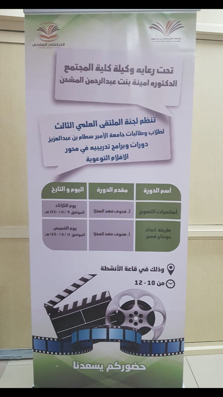 انطلاقاً من تحضير طالبات كلية المجتمع بالخرج للملتقى العلمي الثالث وتحفيزهن على المشاركة الفاعلة في محاور الملتقى المختلفة تم تقديم ورشه عمل بالتعاون مع نادي الإبداع بالكلية بعنوان: "أساسيات التصوير" من تقديم الأستاذة/ هنوف فهد العقلا.وقد تحدثت فيها عن العناصر الأساسية في التصوير الضوئي وطريقه اختيار أنواع الكاميرا وأنواع تصوير البوتريه ومستويات الكاميرات الاحترافية، كما تحدثت عن برامج معالجه الصور وبرامج الجوال المستخدمة في التصوير وشهدت الفعالية حضور عدد كبير من الطالبات.وأشارت وكيلة الكلية د. أمينة المشحن أن الكلية تعتني عناية خاصة بمشاركة الطالبات في الأنشطة الطلابية المختلفة، وخصوصاً برامج الملتقى العلمي لما لها من دور في تنمية مواهب الطالبات واكتشاف قدراتهن. وقد حثت د. المشحن الطالبات على المشاركة برامج الكلية المختلفة، التي تقدمها الكلية خلال هذا الفصل الدراسي