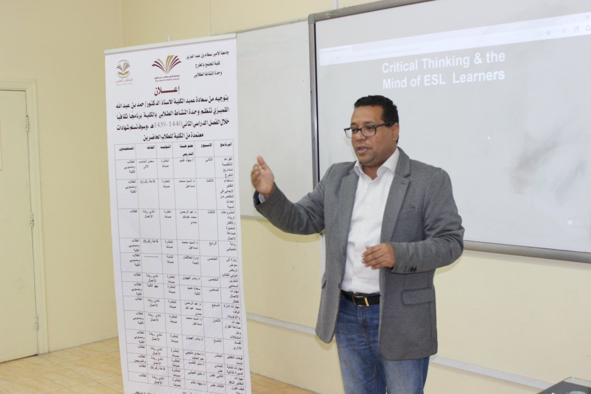حرصا من كلية المجتمع بالخرج على تنمية مهارات التفكير الناقد لطلابها وربطها بالجوانب الدراسية والحياتية لكي يتم إعدادهم فكريًا ومعرفيًا بصورة مثلي, قامت وحدة الأنشطة الطلابية متمثلة في اللجنة الثقافية بكلية المجتمع بتقديم دورة تدريبية تحت عنوان " كيف تكتسب مهارات التفكير الناقد" وذلك يوم الأربعاء الموافق 24/5/1440 وقد قدمها الدكتور/السيد إسماعيل بقسم اللغة الانجليزية وقد تناولت ا مفهوم التفكير الناقد وعناصر التفكير الناقد وكيف تمارس التفكير الناقد كما ربطت بين التفكير الناقد والجوانب الحياتية والمعرفية لدي طلاب وتناولت أهمية اكتساب تلك المهارة وأثارها الايجابية علي تحصيلهم الدراسي الجيد ونموهم المعرفي وأهمية التفكير الناقد الطلاب في تحفيز الطلاب علي إدراك جوانب القصور لديهم سواًء على المستوى الدراسي أو المستوى الشخصي وكيف أن مفهوم التعليم يقوم على الفهم ونقد المعرفة ولا يعتمد علي الحفظ وكذلك تناولت بعض الأمثلة لبعض الأنظمة التعليمية في الغرب واليابان التي طبقت مهارات التفكير النقدي في منهاجها الدراسية وكيف ساهم ذلك في تطوير خريجيها وجعلهم مبدعون في دراستهم وحياتهم وكذلك ركزت على أهمية تعلم فن صناعة الأفكار المبدعة من خلال تنمية مهارات التفكير النقدي وفي نهاية المحاضرة تم تحفيز الطلاب علي العلم والتعلم وأهمية التفكير في تعاليم الإسلام فقد وردت العديد من آيات القران الكريم التي تدعو البشر إلى التدبر والتفكر والتأمل.