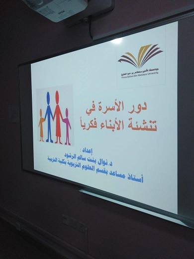 تحت رعاية وكيلة كلية المجتمع بالخرج الدكتورة /أمينة عبد الرحمن المشحن، وبالتعاون مع وحدة التوعية الفكرية بجامعة الأمير سطام بن عبد العزيز وضمن مشروع نحو جامعة واعية 3 ، وبإشراف منسقة وحدة التوعية الفكرية بالكلية الأستاذة / رفيدة قمر الدولة محمد أقامت الكلية محاضرة بعنوان "دور الاسرة في تنشئة الأبناء فكرياً " يوم الاثنين الموافق 25/7/1440هـ من تقديم الدكتورة / نوال سالم الرشود. وبحضور كوكبة متميزة من طالبات ومنسوبات الكلية وأعضاء هيئة التدريس، وقد تحدثت الدكتورة نوال في المحاضرة عن الأسرة وتعريفها وأهم مقوماتها وخصائصها وكيفية معرفة الأدوار لكل فرد في الأسرة وأشارت الى ضرورة الحوار والتكاتف بين أفراد الأسرة وتربية الأبناء على القيم الإسلامية الرشيدة وغرسها في نفوس الأطفال منذ الصغر والابتعاد عن المزح الذي قد يترسخ في عقليتهم ويؤدي بهم الى أفكار تؤثر سلباً على الاسرة والمجتمع.وفي ختام البرنامج تم تكريم الدكتورة نوال الرشود من قبل إدارة الكلية .