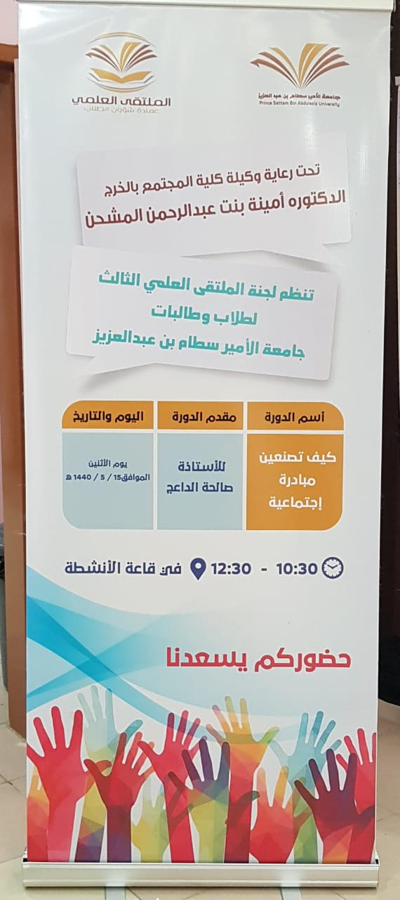 استمراراً في تحضير طالبات كلية المجتمع للملتقى العلمي الثالث ومن أجل تحفيزهم على المشاركة في محور المبادرات التطوعية تم تقديم ورشه عمل بالتعاون مع المجلس الطلابي يوم الاثنين 15/5/1440هـ، بعنوان "كيف تصنعين مبادرة تطوعية" تقديم الأستاذة والمدربة المعتمدة/ صالحة الداعج.تحدثت فيها الأستاذة عن المبادرات والخدمات المجتمعية وكيفية اختيار فكره المبادرة ومن ثم العمل على تطبيقها وأوضحت للطالبات بأن المبادرات التطوعية تعني الالتزام بمفهومها وان لا ينتظر أصحابها الحصول على التمويل لفكرتهم بل يحاولوا تطبيقها بالمتاح معهم فالمهم هو تحقيق الأثر المرغوب من المبادرة وهذا لا يعني عدم وجود بعض المبادرات التي قد تحتاج إلى تمويل لكن الأغلب تعتمد على فكره التطوع وشهدت الفعالية حضور عدد كبير من الطالبات اللاتي شاركن وناقشن في محاور الورشة المتنوعة.