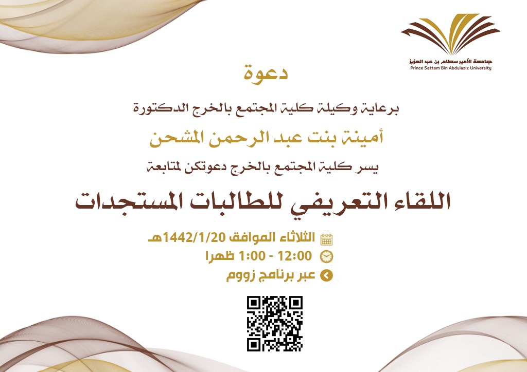 بتوجيه من سعادة عميد كلية المجتمع بالخرج وبمتابعة مباشرة من سعادة وكيلة الكلية الدكتورة/ أمينة بنت عبدالرحمن المشحن؛ أقامت وحدة العمل الطلابي بالتعاون مع وحدة الإرشاد الأكاديمي، لقاء تعريفياً عن بعد (عبر نظام البلاك بورد) للطالبات المستجدات وذلك يوم الثلاثاء الموافق ٢٧/ ١/ ١٤٤٢هـ.