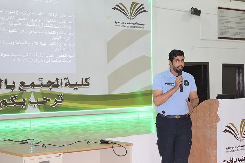 تحت رعاية سعادة عميد كلية المجتمع بالخرج وفي إطار حرص الكلية على تحقيق مخرجات برنامج الأمن والسلامة المهنية وانطلاقاً من تعزيز الشراكات المجتمعية التي تربط الكلية بشركائها ، نظّم نادي ريادة الأعمال بالتعاون مع الدفاع المدني بالخرج ورشة عمل تحت عنوان "أساسيات الأمن والسلامة المهنية والوقاية ضد الحرائق والمواد الخطرة" قدمها سعادة الرقيب المدرب / هليل بن عبد الله الحربي وذلك مساء يوم الأربعاء 25/02/1441 هــ. وتطرق سعادة الرقيب إلى عدة محاور أساسية تتعلق بأهمية الأمن والسلامة المهنية في المنشآت الحكومية والخاصة ودورها في الحفاظ على الممتلكات وتحسين أداء منظمات العمل. كما تمحور اللقاء حول الأنظمة العالمية والمعتمدة بالمملكة والمتعلقة بالسلامة المهنية. وتابع الرقيب / هليل الحربي اللقاء بمناقشة وشرح التصنيفات العالمية للمواد الخطرة وأنواع الحرائق وكيفية مكافحتها والوقاية ضدها لتجنب الأضرار الجسيمة التي قد تنجر عنها. وتم اختتام ورشة العمل بالرد على جميع استفسارات طلاب برنامج الأمن والسلامة المهنية. وأكد سعادة عميد كلية المجتمع بالخرج الدكتور / حمد بن عبد الله القميزي أن هذه الورشة تعدّ حلقة من سلسلة محاضرات ولقاءات أخرى ستقدمها الكلية لطلاب البرنامج مثل استراتيجيات وآليات الإخلاء ودورة في الإسعافات الأولية وذلك بالتعاون مع إدارة الدفاع المدني وإدارة الهلال الأحمر.