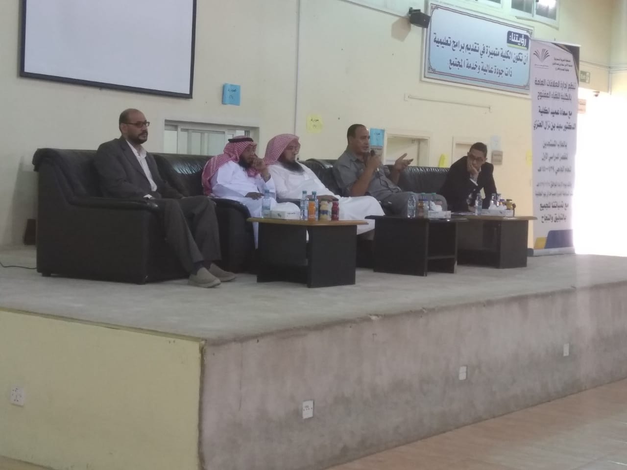 نظمت وحدة النشاط الطلابي بالكلية لقاء مفتوح لسعادة عميد الكلية الدكتور/ سعيد بن نزال العنزي مع الطلاب المستجدين في البرامج المختلفة وذلك يوم الثلاثاء الموافق 25/12/1439هـ في تمام الساعة العاشرة صباحا ببهو الكلية بحضور سعادة وكيل الكلية للشؤون التعليمية والأكاديمية الدكتور/ناصر الشيحان ومشرفي الأقسام الأكاديمية وقد أكد سعادة عميد الكلية على أن ضرورة بذل الطلاب للهمة العالية والصبر حتى يمكنهم الحصول على أعلى المعدلات الدراسية، كما أكد سعادته على ضرورة معرفة الطلاب بالقوانين والإرشادات الطلابية المتعلقة بمواعيد الحذف الإضافة،والحرمان والفصل من الكلية, ومن جانبه أشار سعادة وكيل الكلية للشؤون التعليمية والأكاديمية إلى التحضير الالكتروني للطلاب وما يتطلبه ذلك من ضرورة التزام الطالب بالحضور حتى لا يتعرض للحرمان .كما قام مشرفي الأقسام الأكاديمية بإعطاء نبذة توضيحية للطلاب المستجدين عن طبيعة كل قسم من حيث المقررات الدراسية بالقسم والوظائف التي يوفرها كل برنامج لخريجه وأهمية استفادة الطلاب من الإرشاد الأكاديمي بالكلية.