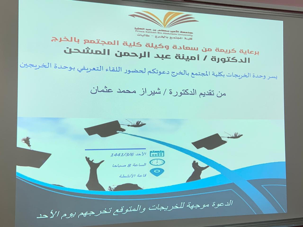 برعاية من وكيلة كلية المجتمع بالخرج الدكتورة/ أمينة بنت عبدالرحمن المشحن؛ أقامت وحدة الخريجين بالكلية "لقاء تعريفي بوحدة الخريجين" وذلك يوم الأحد الموافق ٥-٣-١٤٤١هـ في قاعة الأنشطة الطلابية؛ من تقديم الدكتورة / شيراز محمد عثمان مساعدة المشرف على قسم إدارة الأعمال ومنسقة وحدة الخرجين بالكلية.ويهدف اللقاء إلى التعريف بلجان وحدة الخريجات وهي:١/لجنة التدريب المهني.٢/لجنة المرشد المهني.٣/لجنه التأهيل الوظيفي.4/لجنة مشاريع التخرج.وقد تناولت الدكتورة أهداف كل لجنة بالتفصيل والتعريف بهذه اللجان وحث الطالبات على المشاركة في الفعاليات والأنشطة التي تقدمها اللجان، وقد شهد اللقاء حضور عدد كبير من طالبات الكلية اللاتي ناقشن مع الدكتورة عدد من الأسئلة وناقشن كذلك مجموعة من المقترحات والفعاليات لإدراجها في أعمال اللجان.