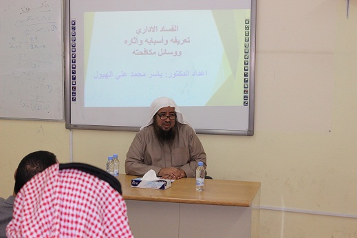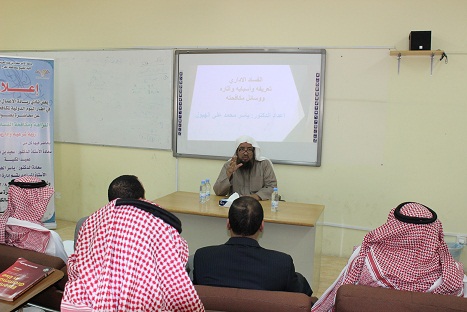 محاضرة النزاهة ومكافحة الفساد الإداري رؤية شرعية وإدارية   في إطار اليوم العالمي لمكافحة الفساد نظمت وحدة النشاط الطلابي بكلية المجتمع بالخرج محاضرة بعنوان " النزاهة ومكافحة الفساد الإداري رؤية شرعية وإدارية " وذلك يوم الأربعاء الموافق 8/3/1438هـ وقد قدم المحاضرة كل من سعادة الأستاذ الدكتور/ سعيد بن نزال العنزي عميد الكلية حيث تناول الفساد من الناحية الشرعية والأدلة من القرآن الكريم والسنة النبوية الشريفة التى تحرم وتحذر من الفساد، وقد أشار سعادته إلى أن القرآن الكريم وردت فيه كلمة الفساد وتصريفاتها ما يقارب خمسين مرة  ، كما تتناول سعادته أسباب الفساد وطرق علاجه.في حين تناول تحليل الجانب الإداري للفساد سعادة الدكتور/ ياسر الهبول الاستاذ المساعد بقسم إدارة الأعمال بالكلية حيث أشار سعادته إلى  أن ظاهرة الفساد الاداري أصابت جميع مجتمعات العالم النامية والمتقدمة منها على حد سواء وإن كانت بدرجات متفاوتة. ووفقًا لتقرير منظمة الشفافية العالمية الصادر عام 2015م جاءت قطر والأمارات والاردن والسعودية هي الأقل فسادًا بين الدول العربية بينما جاءت الصومال على رأس قائمة الدول الأكثر فسادًا مع كوريا الشمالية، ولعل ذلك قد يرجع إلى ما اتخذته المملكة من آليات فعالة لمكافحة الفساد في كافة القطاعات.