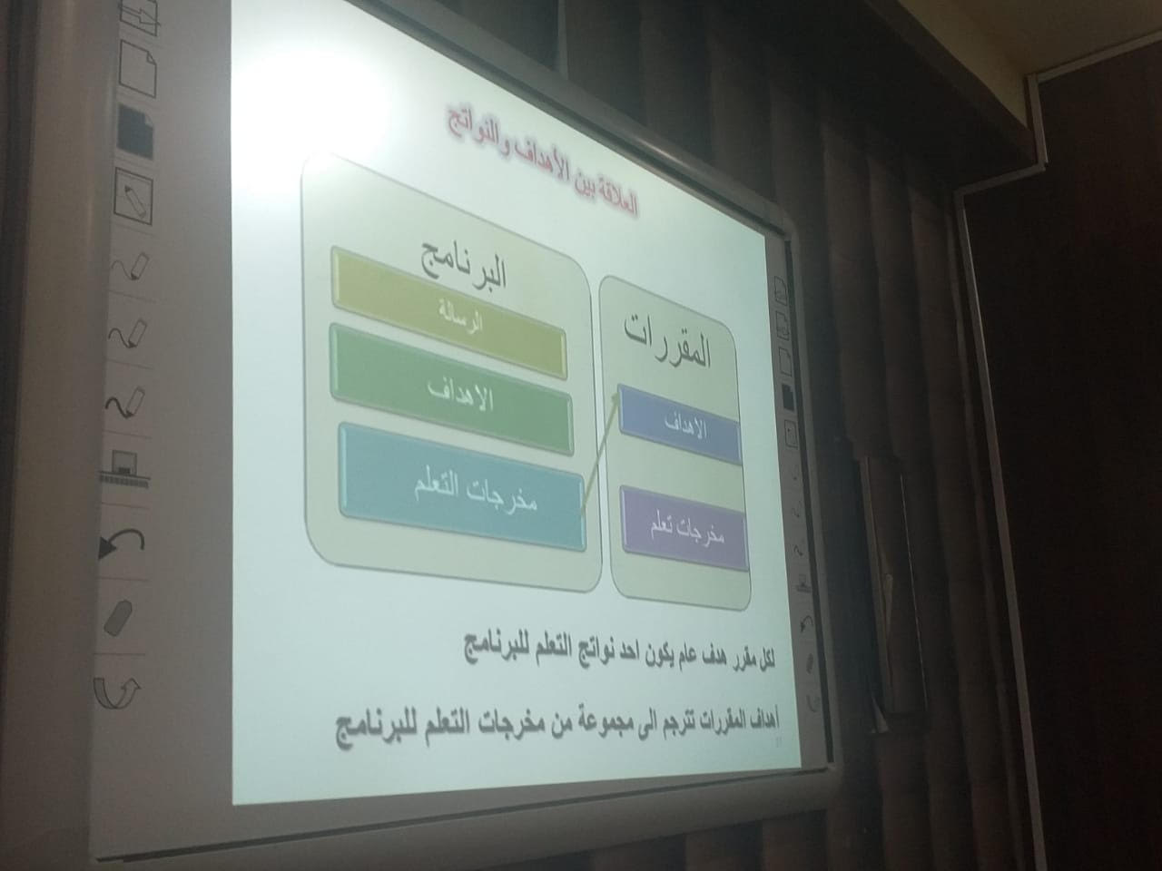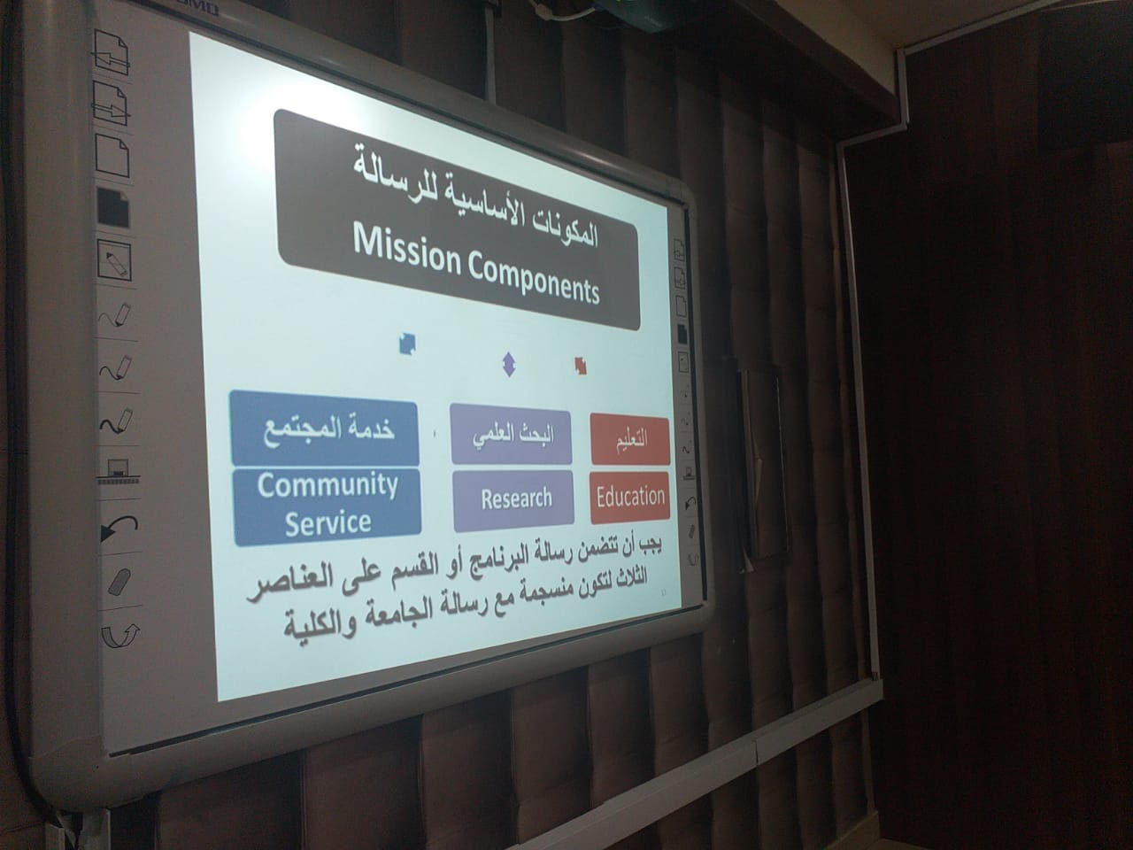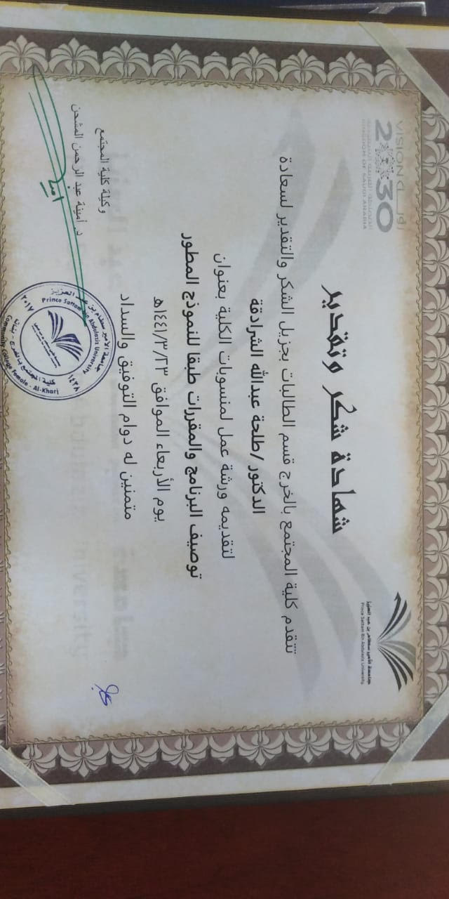 نوره دحيم شبيب الدوسري برعاية وكيلة كلية المجتمع بالخرج الدكتورة/ أمينه بنت عبدالرحمن المشحن ؛ و إشراف مباشر من وكيل الكلية للدراسات العليا والبحث العلمي والجودة وخدمة المجتمع الدكتور/ محفوظ الدوسري؛ أقامت وحدة التطوير والجودة يوم الأربعاء الموافق 23-3-1441هـ ورشة عمل لعضوات هيئة التدريس بالكلية؛ بعنوان "توصيف البرنامج و المقررات طبقاً للنموذج المطور من الهيئة الوطنية " قدمها الدكتور/ طلحة عبدالله الشرادقه؛ من قسم اللغة الإنجليزية بكلية المجتمع.وتناولت الورشة عدداً من المحاور كان من أهمها توصيف البرنامج والمقررات طبقا للنموذج الجديد من الهيئة الوطنية وأيضاً العناصر الأساسية لرسالة البرنامج كما تم تناول العلاقة بين أهداف البرنامج والمقررات مع نواتج التعلم وتم شرحها بالتفصيل ووضح الدكتور طلحة كذلك آليه قياس مخرجات التعلم وطرق القياس المختلفة مع أمثلة على كيفية صياغة مخرجات التعلم والأهداف. وشهدت الورشة حضور كبير من عضوات هيئة التدريس بالكلية.وفي نهاية الورشة تقدمت سعادة وكيلة الكلية بشكرها لوكيل الكلية للدراسات العليا والبحث العلمي والجودة وخدمة المجتمع الدكتور/ محفوظ الدوسري، ولمساعدة وكيل الكلية للجودة والتطوير والدراسات العليا والبحث العلمي وخدمة المجتمع الأستاذة /عزه النيل عثمان. لتقديم مثل هذه الورشة التي تعود بالفائدة لعضوات هيئة التدريس بالكلية؛ كما تقدمت بشكرها لوحدة العلاقات العامة والإعلام بالكلية لتنظيم وتنسيق الفعالية.