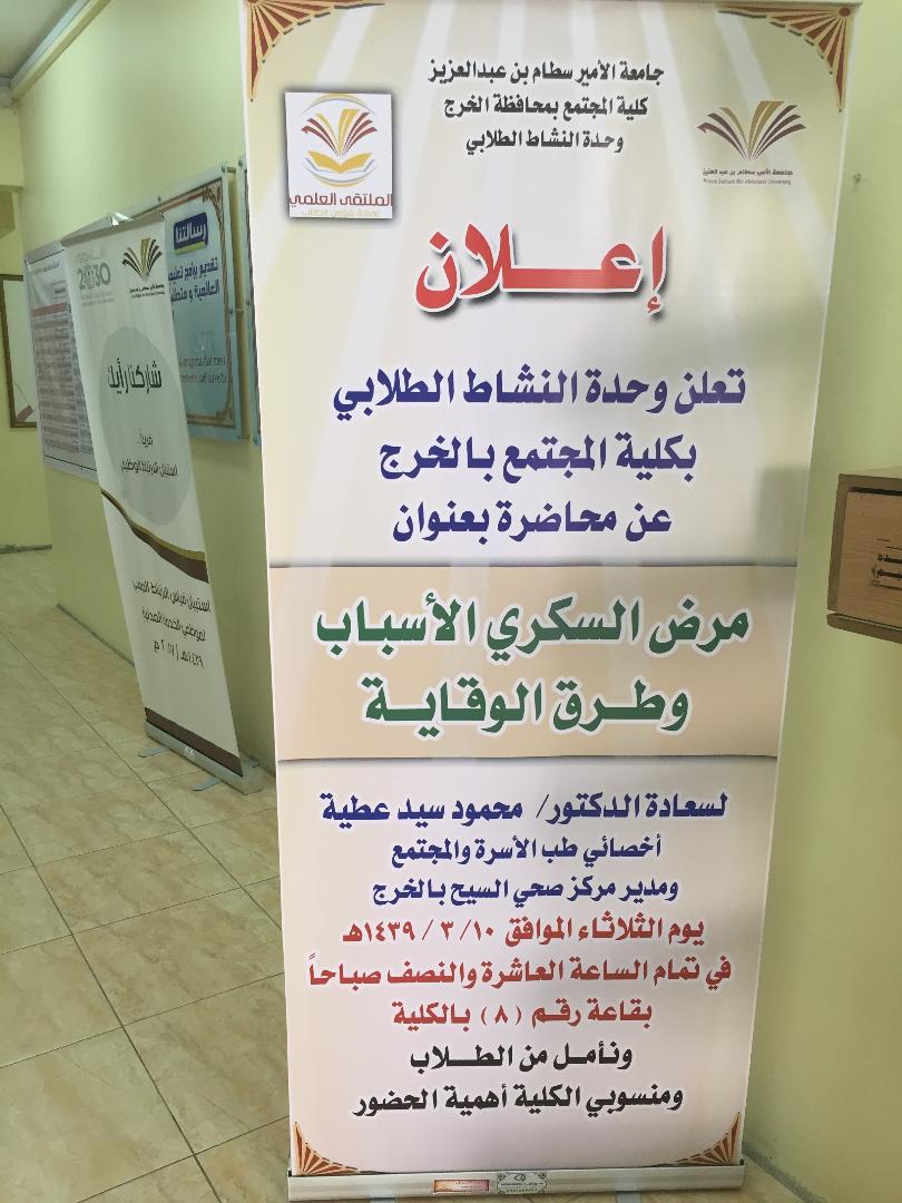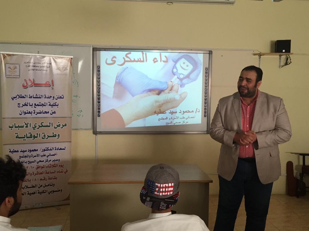 نظمت وحدة النشاط الطلابي بكلية المجتمع بالخرج محاضرة توعوية بعنوان" مرض السكري الأسباب وطرق الوقاية" وذلك يوم الثلاثاء الموافق 10/3/1439هـ لسعادة الدكتور/ محمود سيد عطية مدير مركز صحي السيح بالخرج وقد أشار سعادته إلى أن مرض السكري يرجع إلى الاضطرابات في هرمون الانسولين الذي ينتجه البنكرياس.وأن من أهم أسباب الاصابة بمرض السكري هو زيادة الوزن، العوامل الوارثية، وقلة النشاط البدني، وارتفاع ضغط الدم، وفرط الكولسترول. وقد يؤدي مرض السكري إلى عدة أمراض مثل امراض القلب والأوعية الدموية، اضرار في العينين، وأضرار في الجلد والفم، والعظام والمفاصل. وقد أشار سعادته إلى علاج مرض السكري يتطلب التغذية الصحية السليمة، وممارسة الرياضة البدنية،وتخفيض الوزن، وحقن الأنسولين.