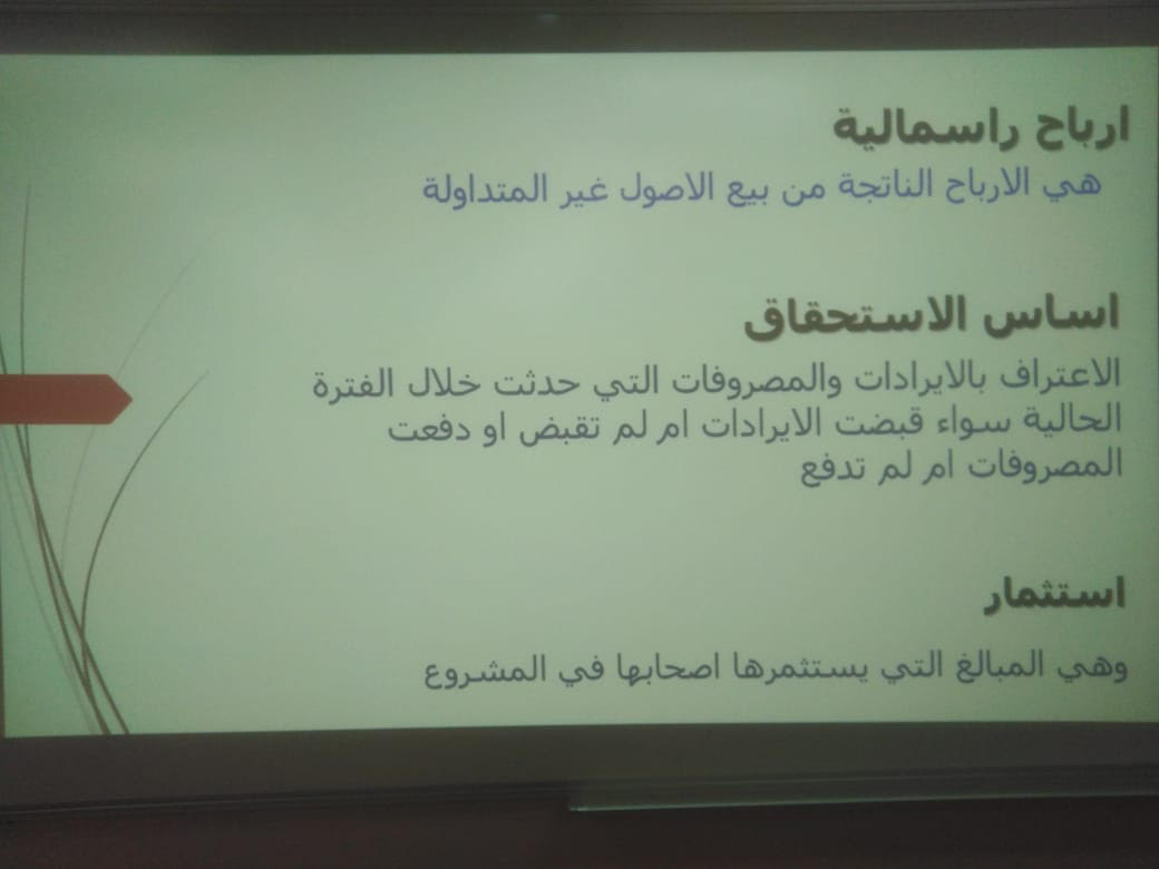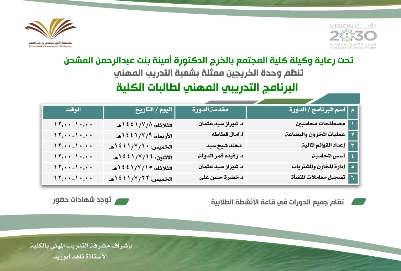 نوره دحيم شبيب الدوسريأقامت وحدة الخريجين ممثلة بشعبة التدريب المهني يوم الثلاثاء الموافق 8-7-1441هـ دورة تدريبية تحت عنوان " مصطلحات محاسبية" من تقديم الدكتور/ شيراز محمد عثمان مساعدة المشرف على قسم إدارة الأعمال بالكلية حيث اشتملت الدورة على التعريف بأهم المصطلحات المحاسبية وكيفية إعداد الميزانية ومعرفه حساب الربح والخسارة بالنسبة للمؤسسات والاستثمارات والرواتب والأجور والأصول المتداولة وغيرها كما تطرقت الى الحديث عن الاستثمار طويل الأجل والاستثمار قصير الأجل وأنواع الأصول كالأصول الثابتة والأصول الغير ملموسة والأصول المتداولة؛ وتطرقت كذلك الى العديد من المحاور المتعلقة بالمحاسبة. وفي نهاية الدورة التدريبية تقدمت سعادة وكيلة الكلية الدكتورة / أمينة بنت عبدالرحمن المشحن بخالص الشكر لوحدة الخريجين ممثلة بشعبة التدريب المهني وللدكتورة شيراز محمد على تقديمها الدورة ولمنسوبات الكلية وطالباتها على الحضور والمشاركة .