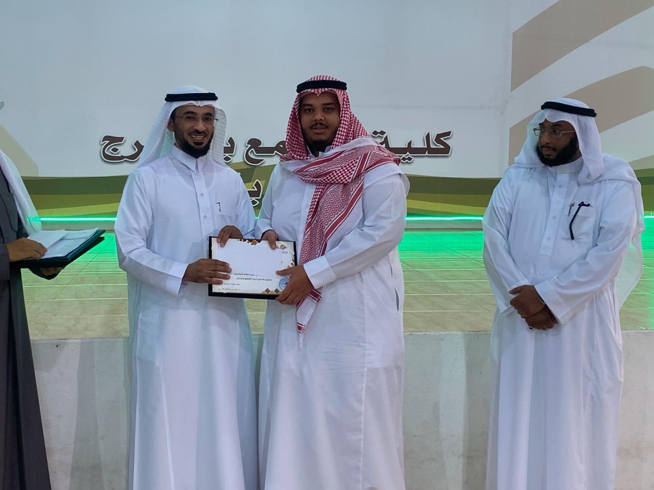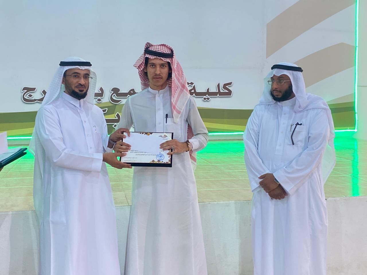 رعى سعادة عميد الكلية د. حمد بن عبدالله القميزي الحفل الختامي للأنشطة الطلابية عن الفصل الدراسي الأول من العام الجامعي 1441هـ وذلك يوم الثلاثاء الموافق 6/4/1441هـ، والذي نظمته وحدة النشاط الطلابي بالكلية. وقد استهل الحفل بكلمة لسعادة عميد الكلية أكد فيها أهمية النشاط الطلابي ودوره في بناء شخصية الطالب وتنمية مهارته وصقل خبراته فالعديد من القيادة الإدارية في مختلف المجالات كانوا من المتميزين في الأنشطة الطلابية، كما أكد د. القميزي على أن الكلية ليس لها سقف للطموح وتتطلع إلى تحقيق العديد من الانجازات والتميز في مختلف المجالات ليس فقط على مستوى كليات جامعة الأمير سطام بن عبدالعزيز بل أيضا على مستوى الجامعات السعودية وإن ذلك لن يتحقق إلا بالمشاركة الفعالة للطالب في كافة الأنشطة التي تنظمها الجامعة والكلية، كما أكد على أن الكلية لا تتأخر دائما على تقديم الدعم الكامل للطلاب . هذا وقد تضمنت فقرات برنامج الحفل عرض فيديو وثائقي عن أهم الإنجازات والأنشطة التي قدمتها الكلية خلال الفصل الدراسي الأول قام بإعداده كل من د. ذيب أبوسالم، ود. باسم الحوامدة، ود. سامي الكوفي حيث تم عرض ابرز الانشطة الرياضية والثقافية والاجتماعية وكذلك ما قامت به الكلية من زيارات لبعض مؤسسات المجتمع المحلي مثل الغرفة التجارية، وبنك التنمية الاجتماعية، وشركة المراعي، بالإضافة إلى عرض أهم مشاركات الكلية في مسابقة الجامعة مثل مسابقة القرآن الكريم، ومسابقة مواهب، والسباحة. كما تضمن برنامج الحفل عرض أنشودة بعنوان وطني الحبيب للطالب/ هيثم هديان العنزي والتي استهدفت تحفيز الطلاب على حب الوطن والحفاظ عليه . وفي نهاية الحفل قام سعادة عميد الكلية بتكريم كافة المشاركين في الأنشطة من الطلاب بشهادات تقدير ومكافآت مالية بالإضافة إلى تكريم منسوبي الكلية . وقد أعرب الطلاب المكرمين عن سعادتهم البالغة بهذا التكريم وأن ذلك سوف يكون حافزًا قويًا لهم لبذل المزيد من الجهد للاستفادة من فعاليات الأنشطة الطلابية بالكلية والجامعة وتعزيز وتميز الكلية بين كليات الجامعة الأخرى.