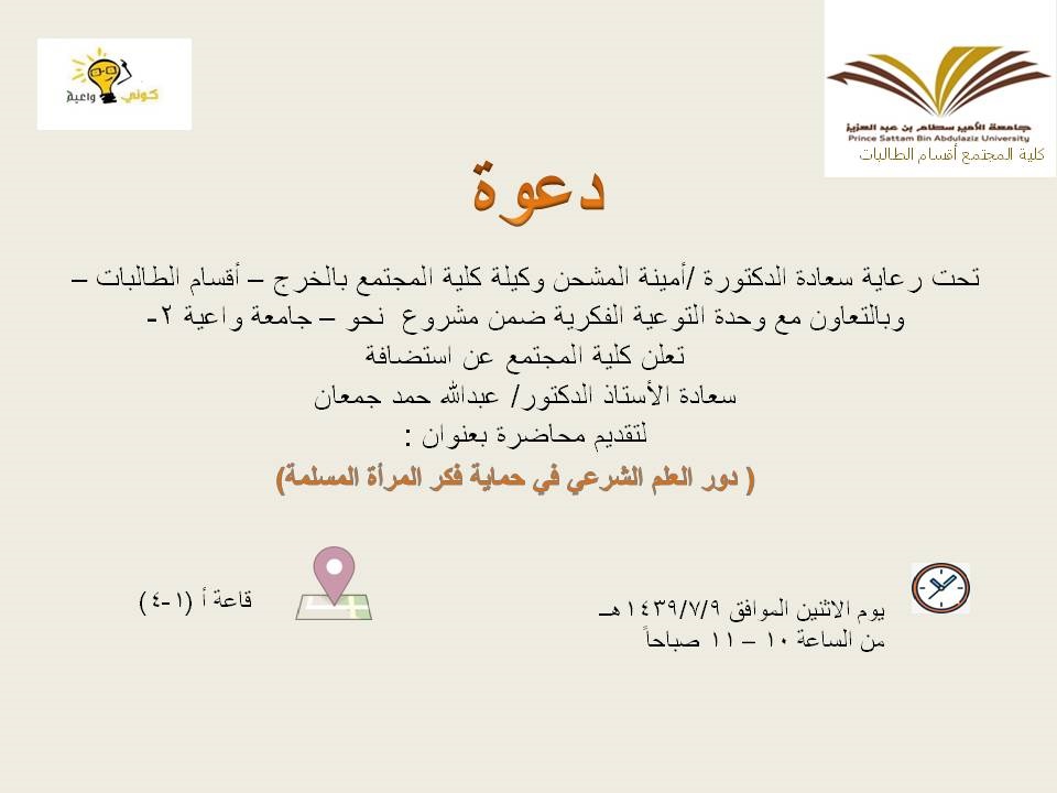 تحت رعاية سعادة الدكتورة / أمينة عبدالرحمن المشحن وكيلة كلية المجتمع بالخرج _أقسام الطالبات- وبالتعاون مع وحدة التوعية الفكرية بجامعة الأمير سطام بن عبدالعزيز ضمن مشروع نحو-جامعة واعية2- يسر كلية المجتمع ان تدعوكم لحضور محاضره بعنوان"دور العلم الشرعي في حماية فكر المرأة المسلمة "والتي سيلقيها سعادة الأستاذ الدكتور /عبدالله حمد جمعانوذلك يوم الأثنين الموافق9/7/1439هـ في تمام الساعة العاشرة صباحاً في مبنى الكليةوالدعوة عامة للجميع .