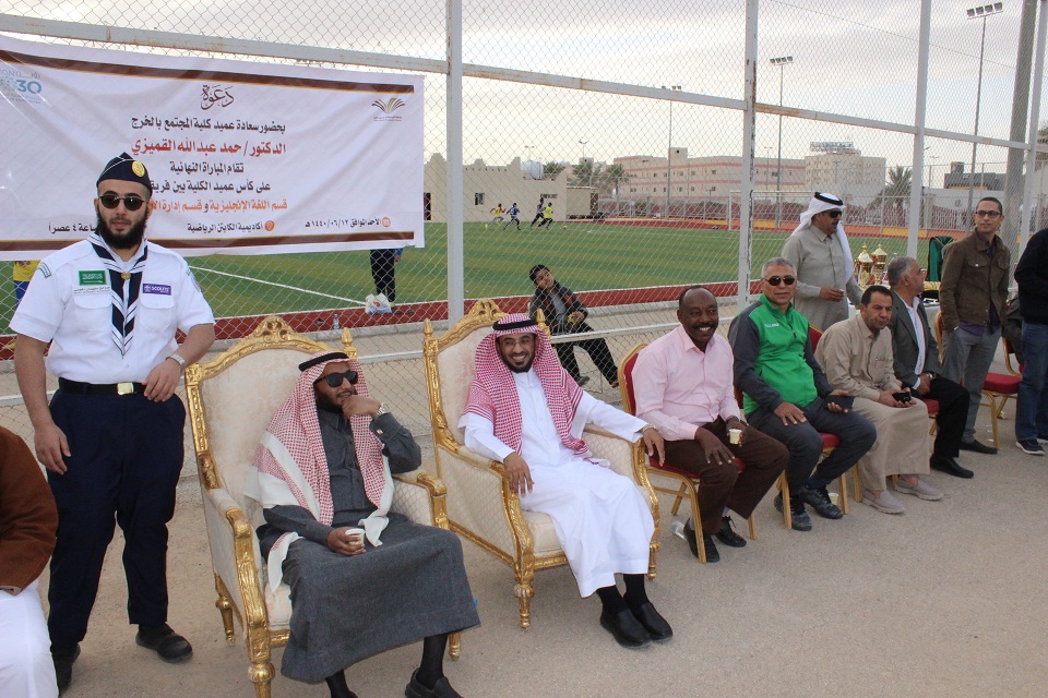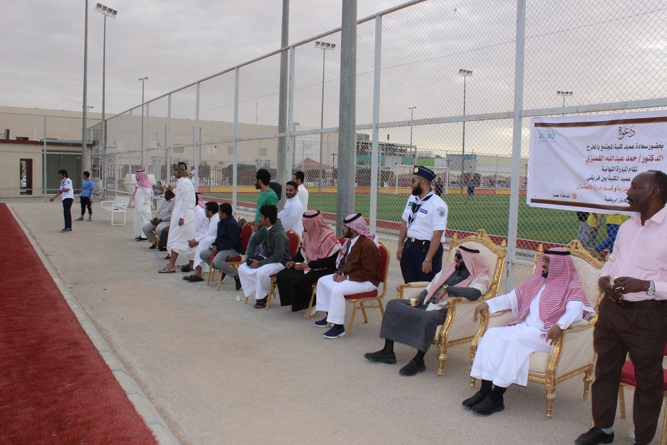 تحت رعاية سعادة عميد كلية المجتمع بالخرج ، أُقيمت يوم الأحد 12/6/1440 هـــ المباراة النهائية لكأس عميد الكلية في كرة القدم والتي دارت بين فريق إدارة الأعمال وفريق اللغة الانجليزية بملعب الكابتن بالخرج. وحضر اللقاء سعادة العميد الدكتور/ حمد بن عبد الله القميزي ووكيل الكلية للشؤون التعليمية والأكاديمية الدكتور/ ناصر بن راشد الشيحان وجمعٌ غفير من منسوبي الكلية من موظفين وأعضاء هيئة التدريس والطلاب. وبعد سيناريو مثير انتهت المباراة بفوز فريق قسم اللغة الإنجليزية بخمسة أهداف مقابل ثلاثة. وإثر اللقاء قام الدكتور القميزي بتتويج الفريق الفائز ببطولة الكأس كما تم تتويج صاحب المركز الثاني ومنح ميداليات لأفضل لاعب واللاعب المثالي وهداف البطولة وأفضل حارس مرمى. كما قدم سعادته كأساً للفريق المثالي الممثل في فريق برنامج الأمن والسلامة المهنية بقسم إدارة الأعمال. واختتم الدكتور القميزي الدورة بشكر الذين أسهموا في نجاح الدورة وبالإشارة إلى أهمية الأنشطة اللاصفية في تطوير العملية الأكاديمية بالكلية.