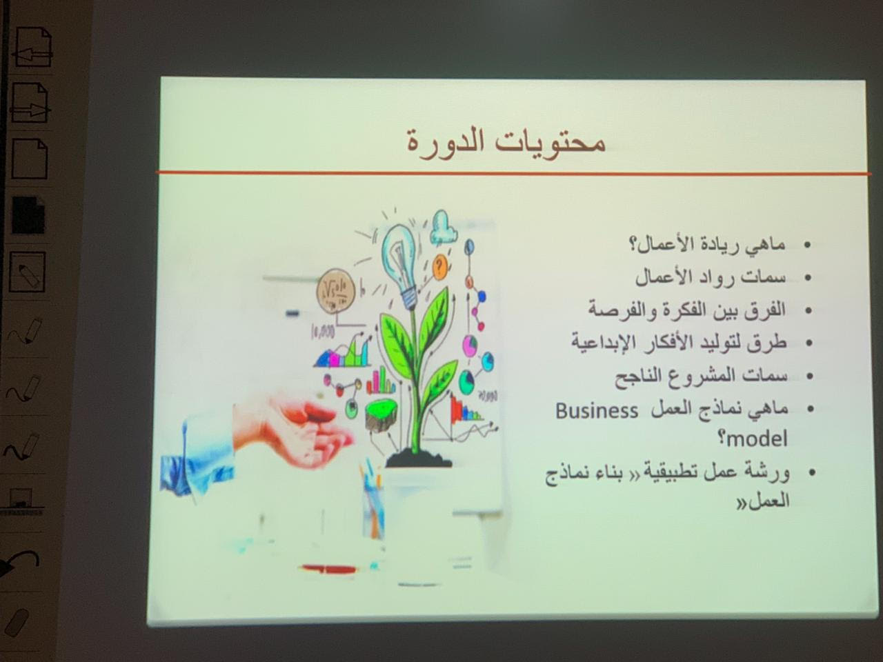 أقام نادي الإبداع بكلية المجتمع بالخرج (أقسام الطالبات) دورة تدريبية بعنوان: "ريادة الأعمال " من تقديم الأستاذة/ لمى العسكر؛ وذلك يوم الاثنين الموافق 6-3-1441هـ وقد تناولت الأستاذة لمى عدداً من المحاور الهامة في الدورة التدريبية كان منها:ماهي ريادة الأعمال؟سمات رواد الأعمال.أمثلة لمشاريع ريادية.الفرق بين الفكرة والفرصة.طرق لتوليد الأفكار الإبداعية.سمات المشروع الناجح.ماهي نماذج العمل ؟وقد تطرقت الأستاذة كذلك إلى تعريف ريادة الأعمال وأنه عمل يتسم بالإبداع ويتصف بالمخاطرة وتطرقت الى عرض مخطط لنموذج عمل تجاري وانتهت الدورة التدريبية بمناقشة الأسئلة التي تم طرحها من قبل الطالبات.وقد أعربت الدكتورة/ أمينة بنت عبد الرحمن المشحن؛ وكيلة الكلية عن شكرها للأستاذة لمى العسكر لتقديمها الدورة التدريبية ولنادي الإبداع بالكلية على جهودهم المقدمة للطالبات.