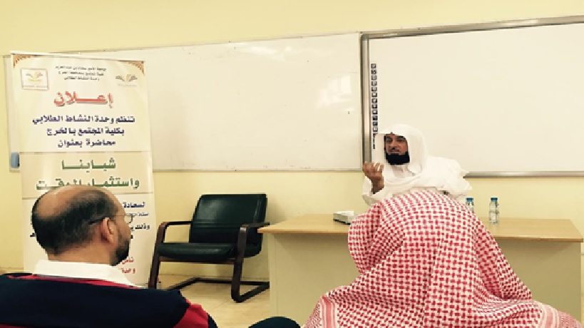 تحت رعاية سعادة الاستاذ الدكتور/ سعيد بن نزال العنزي عميد كلية المجتمع بالخرج نظمت وحدة النشاط الطلابي بالكلية محاضرة بعنوان " شبابنا واستثمار الوقت" لسعادة الاستاذ الدكتور/ عبد الله محمد العسكر استاذ التفسير وعلومه بجامعة الأمير سطام بن عبد العزيز وذلك يوم الاربعاء الموافق 12/6/1439هـ وقد أشار سعادته إلى ضرورة أن ينظم الانسان وقته حتى يحقق أهدافه المنشودة، وأن يجعل حياته كلها لله، فأعلى مراتب النجاح أن يعيش الانسان لإرضاء الله وإحياء كلماته من خلال استغلال الأوقات في الأمور الصالحة والابتعاد عن حرمات الله خوفًا وطعمًا برضاه. كما أشار سعادته إلى ان من أهم طرق استغلال الوقت النافع هي: محاسبة النفس، ومصاحبة الاشخاص المهتمين بالوقت، ومعرفة قصص السلف الصالح، كما أن إدارة الوقت تحتاج إلى قراءة القرآن، والصلاة في وقتها.