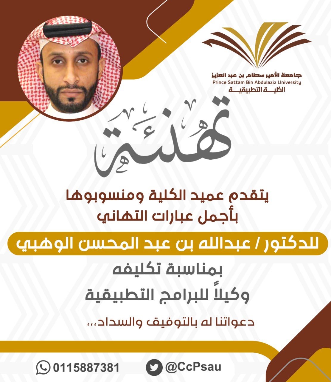 تقدم عميد الكلية ومنسوبوها بأجمل عبارات التهاني للدكتور: عبدالله عبدالمحسن الوهبي بمناسبة تكليف وكيلاً للبرامج التطبيقية.