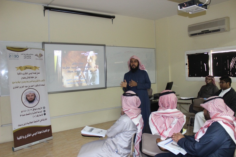 تحت رعاية سعادة مدير الجامعة  أقامت وحدة الوعي الفكري بكلية المجتمع بالخرج حلقة نقاش  عن "الألعاب الإلكترونية أضرارها وطرق الوقاية منها" وذلك يوم الأربعاء الموافق 17/5/1440 هـ،  وقد قدمها سعادة الدكتور/ أحمد بن عبدالعزيز الشثري الأستاذ المساعد بكلية التربية بالخرج،  وقد تناولت الحلقة حقيقة الألعاب الإلكترونية والأصل فيها. كما تطرقت إلى المخالفات الشرعية والاجتماعية التي تحملها العديد من هذه الألعاب . كما قدم الدكتور/ الشثري بعض النصائح والتوجيهات للطلاب لتوضيح طريقة التعامل مع الألعاب الالكترونية للوقاية من مخاطرها. كما تم فتح باب النقاش مع الطلاب للرد على استفساراتهم المتعلقة بهذه الألعاب. وفي نهاية الحلقة تقدم الدكتور/ الشتري بخالص الشكر لسعادة عميد الكلية الدكتور/ حمد بن عبد الله القميزي على اهتمامه ودعمه للأنشطة والبرامج التي تهدف إلى التي تستهدف نشر الثقافة التوعوية لدى الطلاب مما يجنبهم العديد من المخاطر.جانب من استقبال سعادة العميد للدكتور/ الشثري