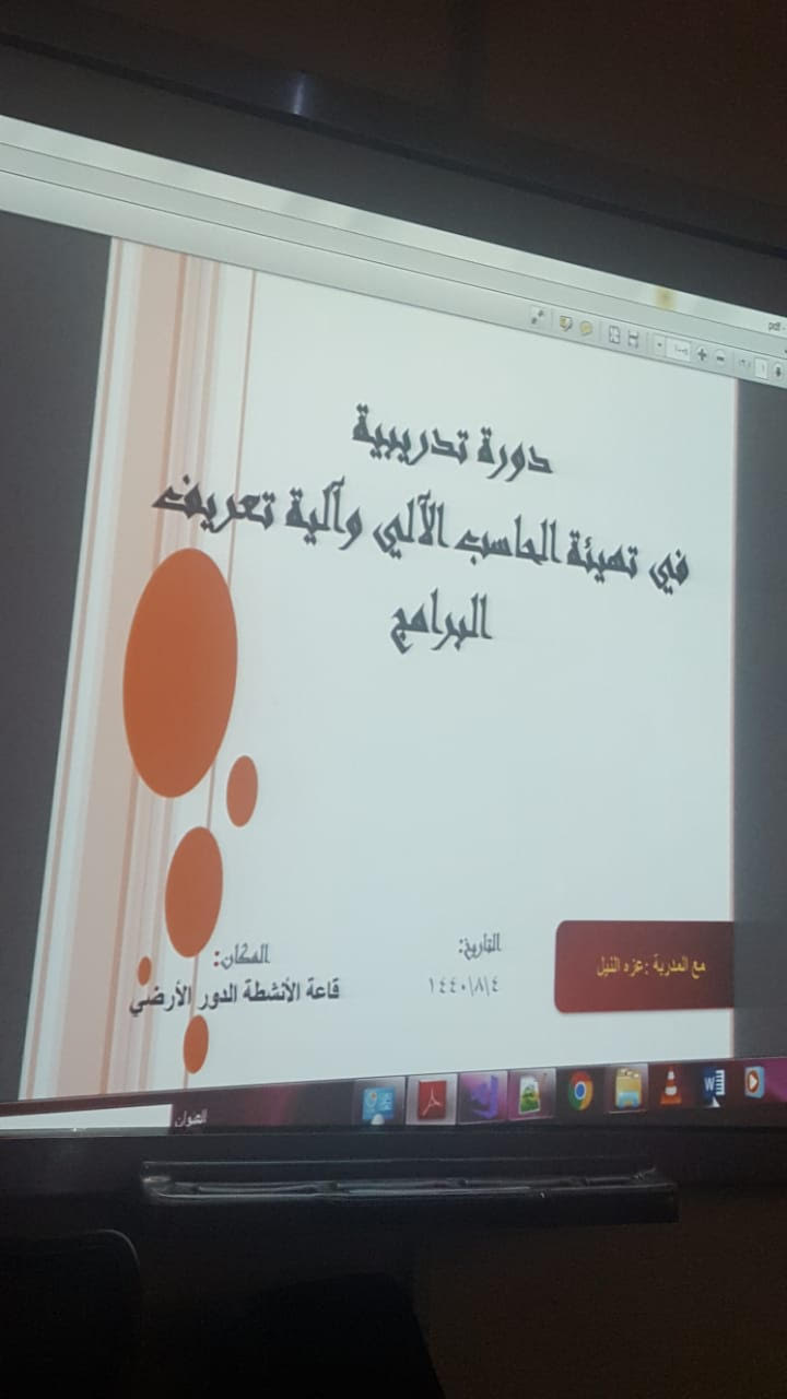في ختام فعاليات الملتقى الإداري الأول المقام بكلية المجتمع بالخرج "الطريق إلى التميز الإداري" عُقدت يوم الأربعاء الموافق5/8/1440هـ دورة تدريبية بعنوان" تهيئة الحاسب الآلي وآلية تعريف البرامج " قدمتها الأستاذة/عزه النيل .