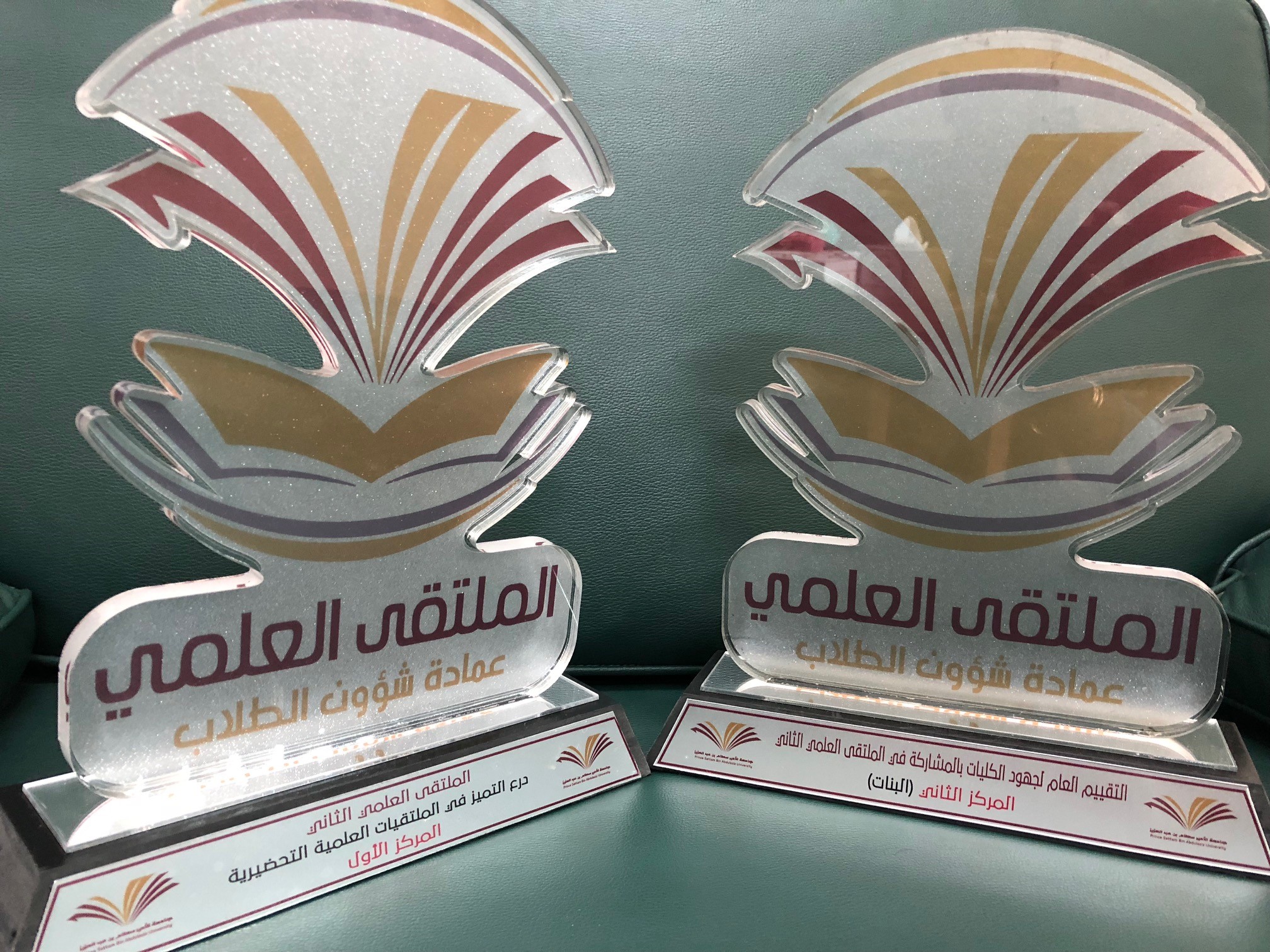 بحمد من الله وتوفيقه حصلت كلية المجتمع –أقسام الطالبات – على المركز الأول في أفضل الملتقيات التحضيرية للملتقى العلمي الثاني والمركز الثاني على الإعداد والمشاركات للملتقى .