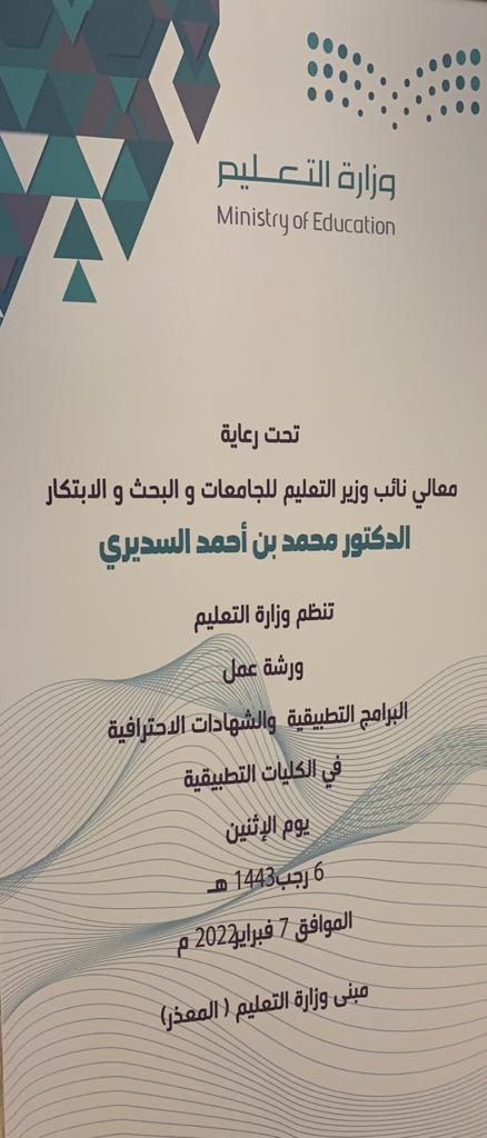 Applied college participated with a research paper about the experience of the college in the transformation into applied college in the events of the workshop organized by the ministry of higher education under the auspice of the Vice Minister of Education for Universities, Research and Innovation on Monday, 6th of Rajab 1443 AH. The research paper is entitled “ Applied programs and professional certificates in the Applied Colleges.